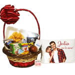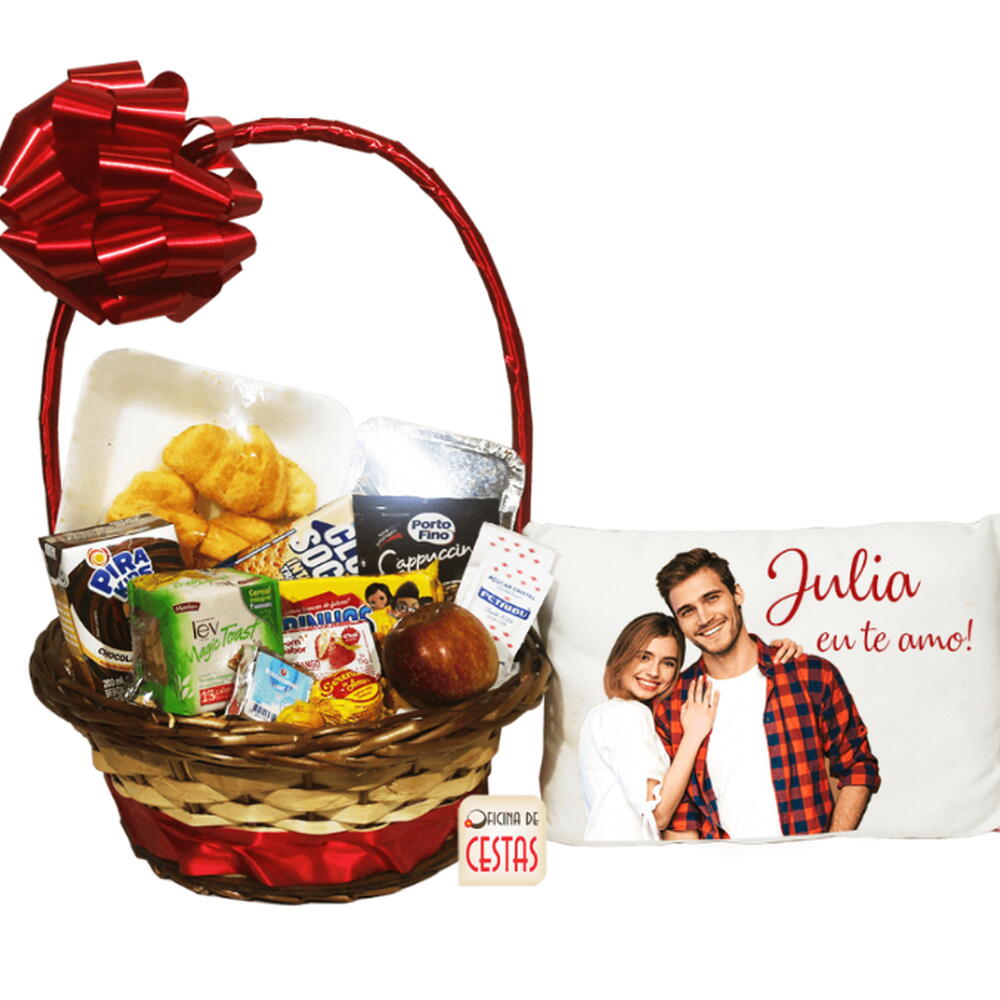 biscoito waffer - 1 pcs achocolatado - 1 pcs polenguinho - 1 pcs mini croissants - 3 pcs geléia - 1 pcs sachês de açúcar - 2 pcs fruta da estação - 1 pcs pacote de torradas - 1 pcs mini bolo para café (sabor baunilha) - 1 pcs sachê de cappuccino ou café - 1 pcs cartão dedicatória personalizado (com mensagem enviada) - 1 pcs unidade de club social - 1 pcs chocolate (garoto ou nestlé ou lacta) - 1 pcs cesta em vime decorada com fitas - 1 pcs almofada 29x20cm personalizada com (foto - 1 pcs frase ou nome do presenteado) - 1 pcs