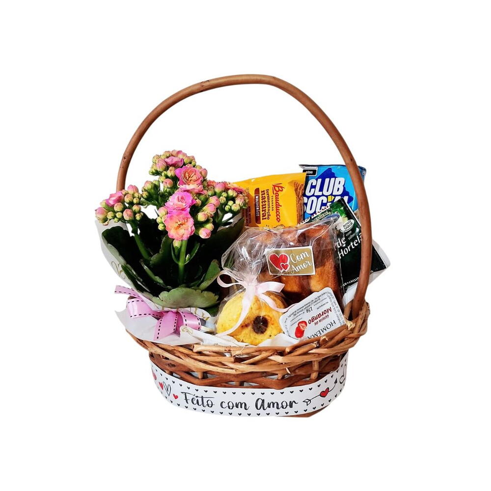 Esta linda Cesta de Café da Manhã é perfeita para começar o dia com um toque especial. Contém um gracioso vaso com mini flores kalenchoe plantadas, cujo a cor será a disponível no dia, adicionando frescor e beleza ao conjunto. A cesta é feita de vime, possui uma elegante alça e é decorada com uma delicada fita com a inscrição Feito com amor. Além disso, vem recheada com delícias para um cafezinho perfeito: três cookies crocantes, um sachê de chá selecionado, um pacote de Clube Social, três bolinhos madeleine que derretem na boca, um pacote com duas torradas crocantes e duas mini geleias para dar um toque doce ao seu café da manhã. Este é o presente perfeito para começar o dia com amor e sabor.