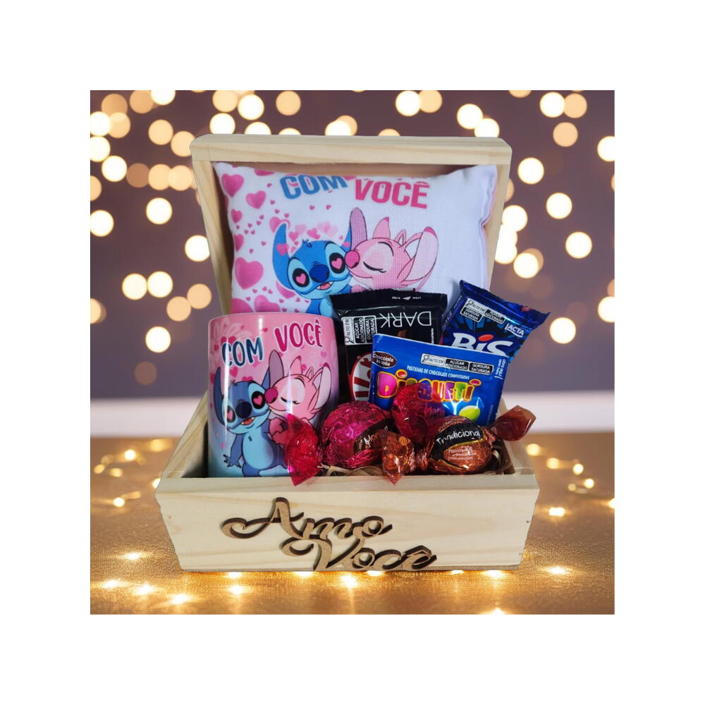 Cesta Chocolates "Amo Você" com Caneca e Almofada "Com Você" Stitch