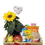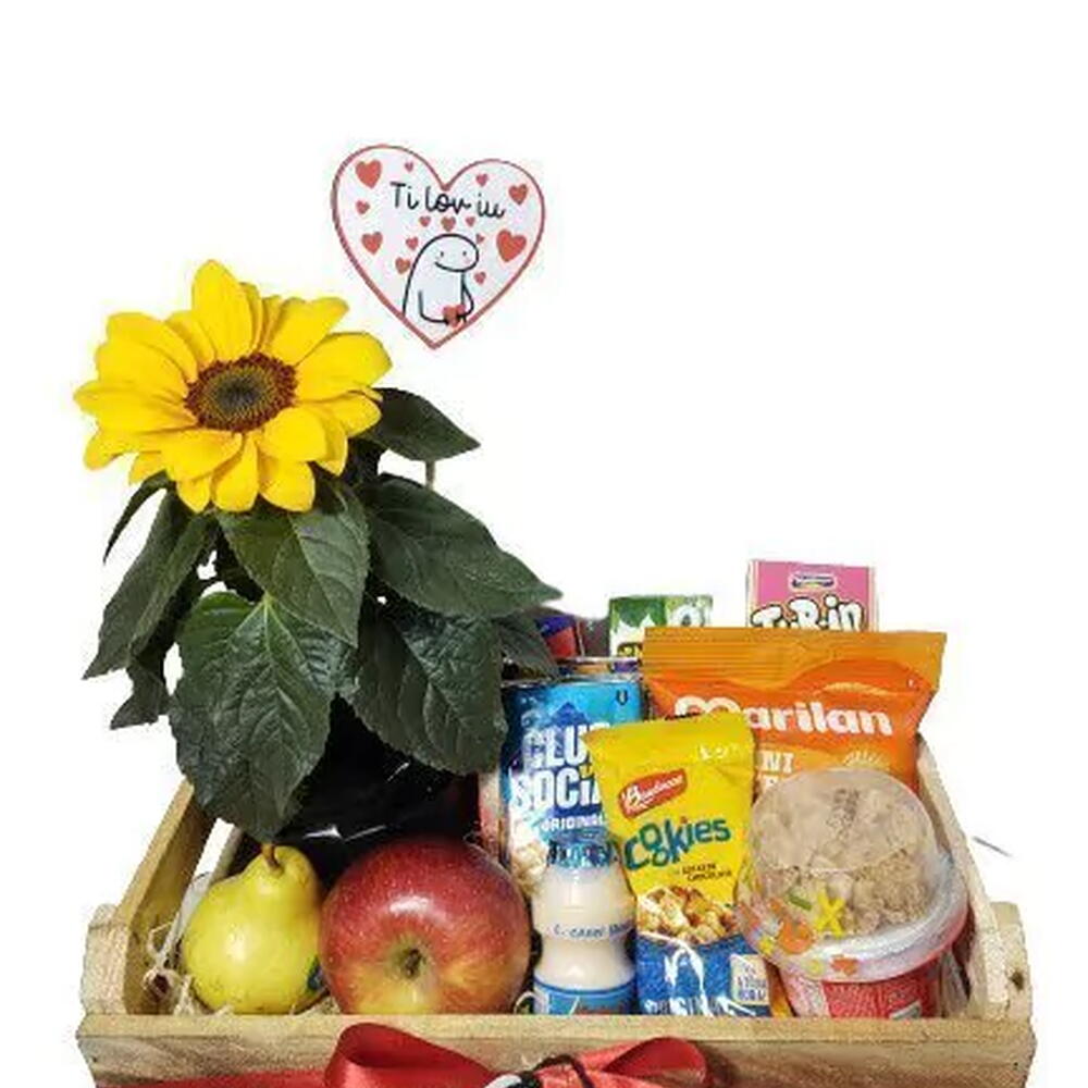 Composição: 01 bandeja 30x20 com um lindo girassol de presente 🌻, 02 frutas de época fresquinhas 🍏🍐, 01 yakut 80g cremoso, 01 pacotinho de cookies 40g delícia, 01 club-social 23g para aquele petisco, 01 polenguinho 17g para dar um toque saboroso, 01 iogurte 150g com sucrilhos de 15g crocantes, 01 mini bolacha de maizena 30g, 01 tub-in 48g de sabor irresistível, 01 suco 200ml e 01 achocolatado 200ml para acompanhar. Duabilidade: As Flores plantadas geralmente duram em média de 10 a 15 dias. Obs: Todos os itens poderão sofrer alterações dependendo da disponibilidade local, sempre mantendo a qualidade.