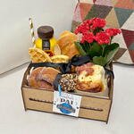 embalagem - 1 pcs laço - 1 pcs rosquinha doce - 1 pcs pão de leite - 1 pcs caixote de madeira 22x15cm - 1 pcs potinho com doce de leite artesanal - 1 pcs mini vasinho de flores kalachoe cores variadas - 1 pcs capuccino 3 corações chocolate 260ml - 1 pcs waffle americana integral - 1 pcs paõ fofinho recheado com frios moído - 1 pcs carolina recheada - 1 pcs