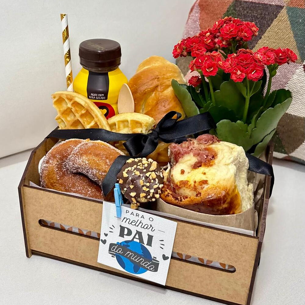 embalagem - 1 pcs laço - 1 pcs rosquinha doce - 1 pcs pão de leite - 1 pcs caixote de madeira 22x15cm - 1 pcs potinho com doce de leite artesanal - 1 pcs mini vasinho de flores kalachoe cores variadas - 1 pcs capuccino 3 corações chocolate 260ml - 1 pcs waffle americana integral - 1 pcs paõ fofinho recheado com frios moído - 1 pcs carolina recheada - 1 pcs