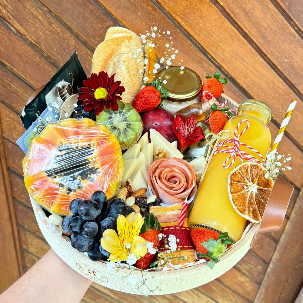 Cesta de madeira redonda com alça de couro 28cm Pão francês integral Yougurte natural no vidrinho Mel no vidrinho Granola Bebida com Whey Protein (disponível do Dia) Frutas selecionadas da época Torradinhas finas veganas (beterraba, espinafre e cenoura) Drip Coffee Gourmet Nozes nuts do Dia Queijo minas padrão Flor de lombo canadense Geléia de frutas vermelhas Queensberry no vidrinho ou Dalfourt A cesta vai pronta para presentear uma pessoa especial para você e que gosta de academia, é uma cesta leve, recheada de frutas e com bebida de whey protein.