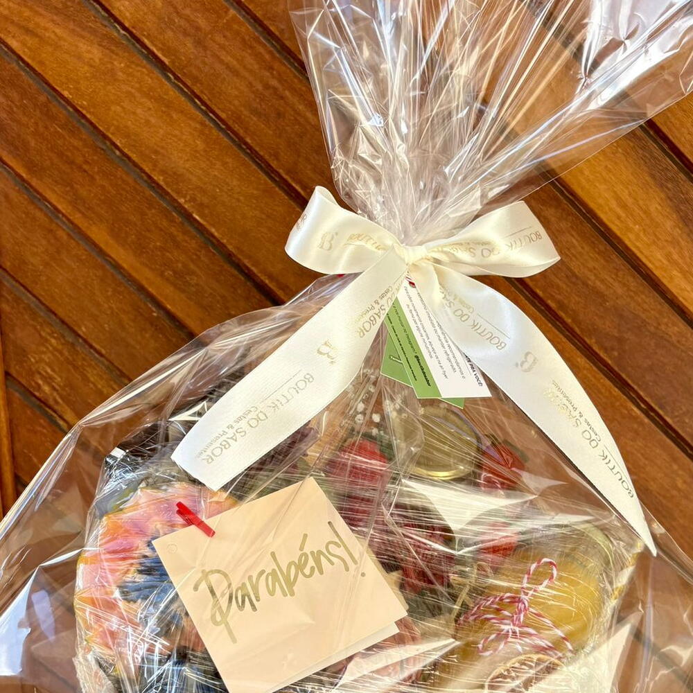laço - 1 pcs granola - 1 pcs yopro - 1 pcs saco celofane transparente para embalar - 1 pcs pão francês integral - 1 pcs porção de frutas selecionadas do dia - 1 pcs yougurte natural no vidrinho - 1 pcs mel no vidrinho - 1 pcs drip coffee gourmet - 1 pcs nozes nuts do dia - 1 pcs queijo minas padrão - 1 pcs flor de lombo canadense - 1 pcs geléia de frutas vermelhas queensberry no vidrinho ou dalfourt - 1 pcs torradinhas finas veganas (beterraba - 1 pcs espinafre e cenoura) - 1 pcs cesta de madeira redonda com alça de couro 28cm de diâmetro - 1 pcs
