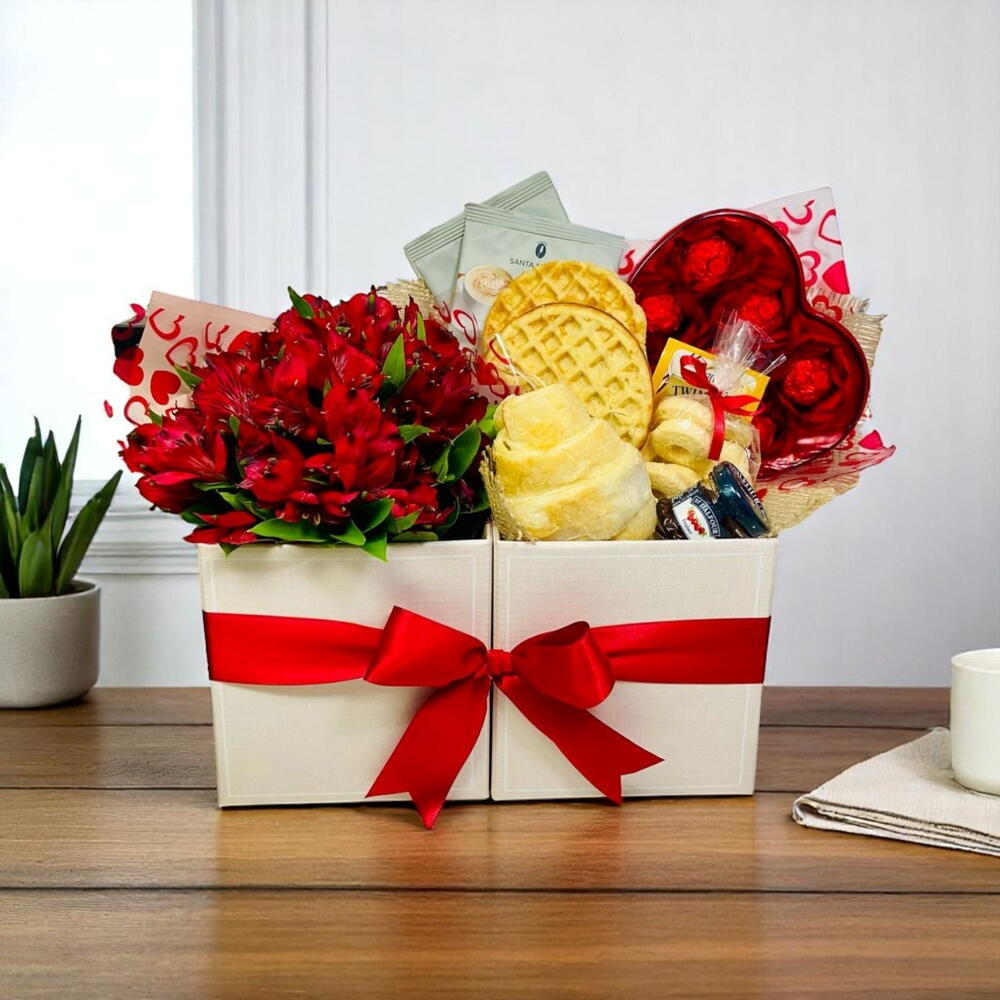 Este produto luxuoso é o sonho de quem ama café da manhã! Uma Cesta de Café de Manhã recheada de delícias, perfeita para surpreender com carinho e sofisticação. Contém 30 unidades de mini delícias, um croissant macio e saboroso, dois waffles apetitosos, acompanha dois sachês de cappuccino Santa Mônica e um sachê de chá Twinings para aquecer o dia. Acompanhado, ainda, de uma deliciosa mini geleia francesa St. Dalfour, um pacote de biscoitos amanteigados que derretem na boca, e uma encantadora caixa de acrílico em formato de coração com bombons Ferrero Rocher para adicionar um toque doce à surpresa. A cesta é completada com um delicado arranjo de flores naturais e decorada com um laço, tornando-a um presente ainda mais especial e exclusivo. Torne alguém feliz com esta maravilha pela manhã!