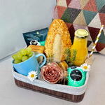 Apresentando a gloriosa Cesta de Café da Manhã, cuidadosamente embalada e amarrada com um laço. No interior, você encontrará um banquete: uvas suculentas, torradinhas crocantes e granola nutritiva. Saboreie a riqueza da manteiga em blister e o revitalizante suco de laranja Natural One. Adoce sua manhã com um toque de mel no vidrinho e uma baguete de queijo parmesão fresquinho. A geléia de frutas vermelhas adiciona uma explosão de sabor, enquanto o café Santa Mônica oferece a dose de energia necessária para começar o dia. Complementando a cesta, temos um yogurte Atilatte cremoso e uma elegante xícara de porcelana azul para sua bebida matinal. Tudo isso, arrumado em uma sofisticada caixa organizadora marrom com tecido bege cru, dando um charme extra para o seu presente. Seja para um aniversário, ocasião especial ou apenas para começar o dia com estilo, nossa Cesta de Café da Manhã é a escolha perfeita.---A cesta já vai embalada pronta para presentear com laço, tag, saco celofane e cartão escrito a mão.