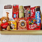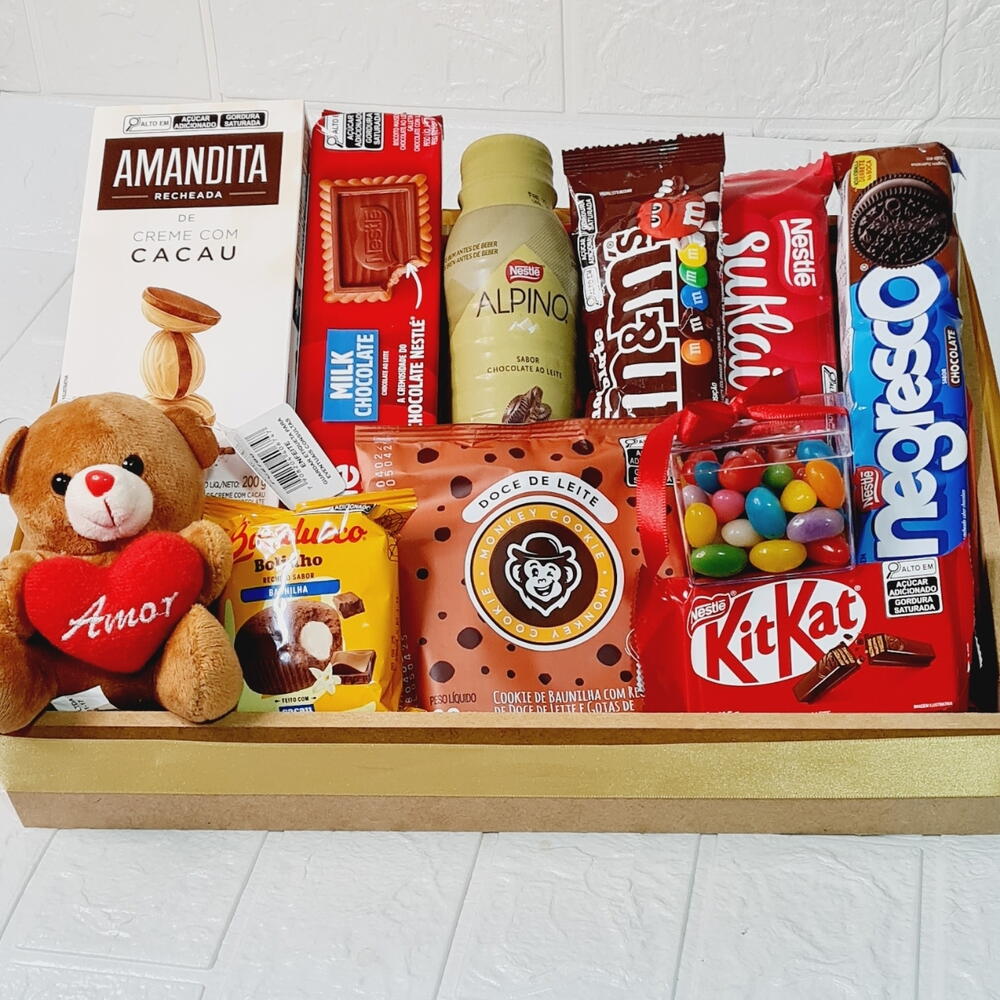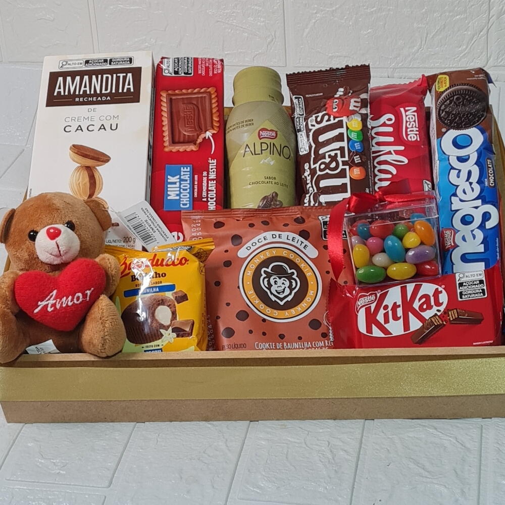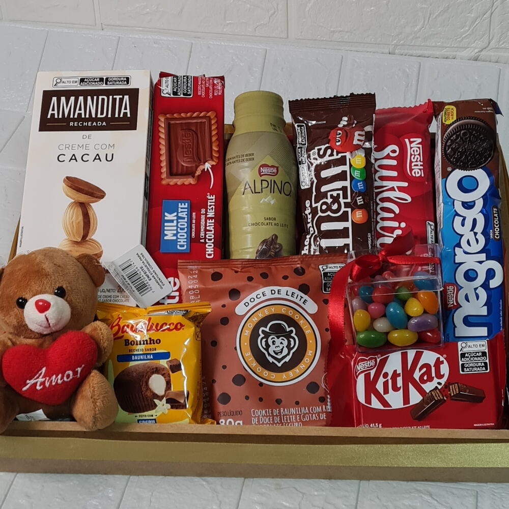 kit kat - 1 pcs laço - 1 pcs bolinho - 1 pcs achocolatado - 1 pcs amanditas - 1 pcs bandeja - 1 pcs embalagem celofane - 1 pcs mini pelúcia - 1 pcs mem - 1 pcs cookies 80 g - 1 pcs 2 biscoitos doces - 2 pcs caixinha com balinhas - 1 pcs sulflair 1 de cada - 1 pcs