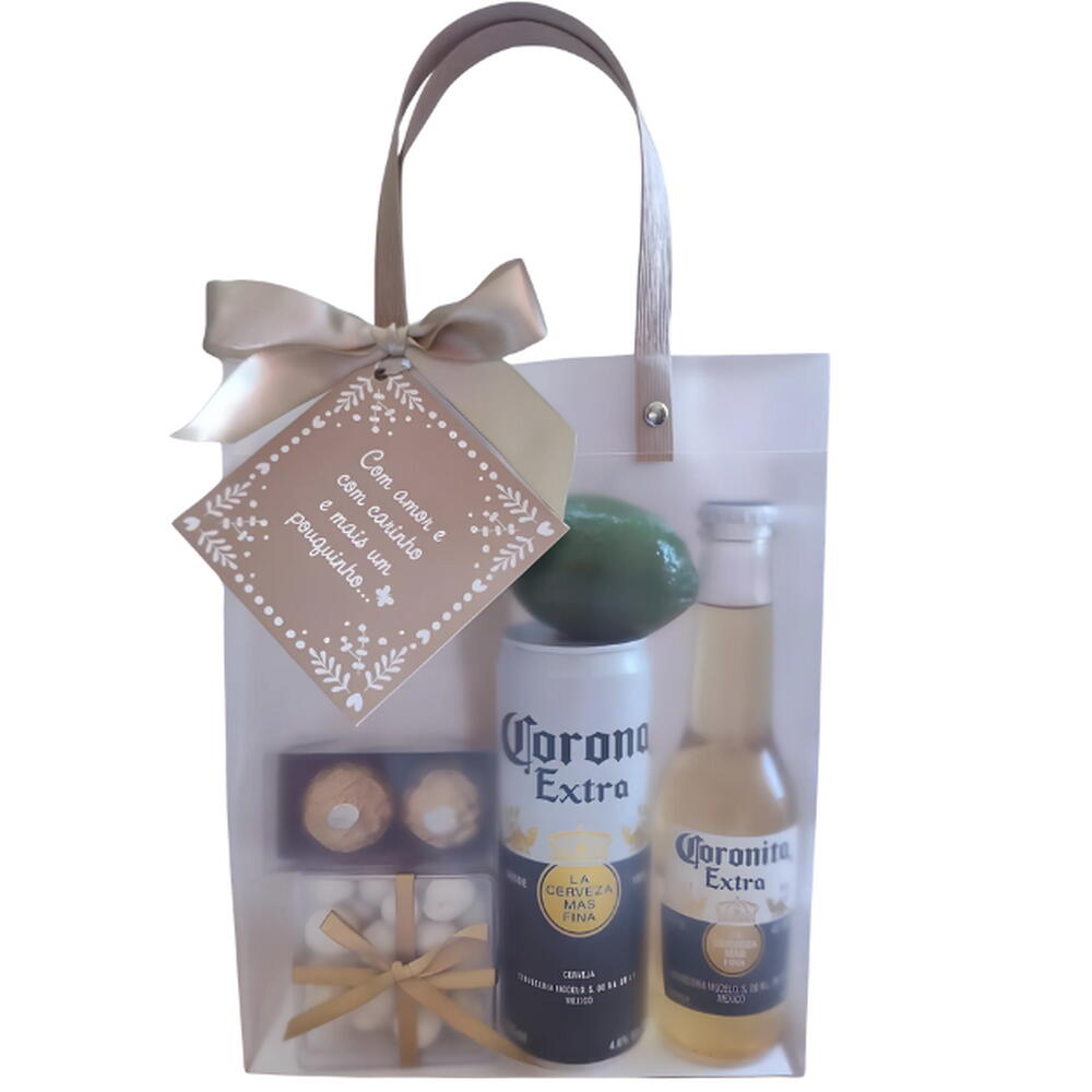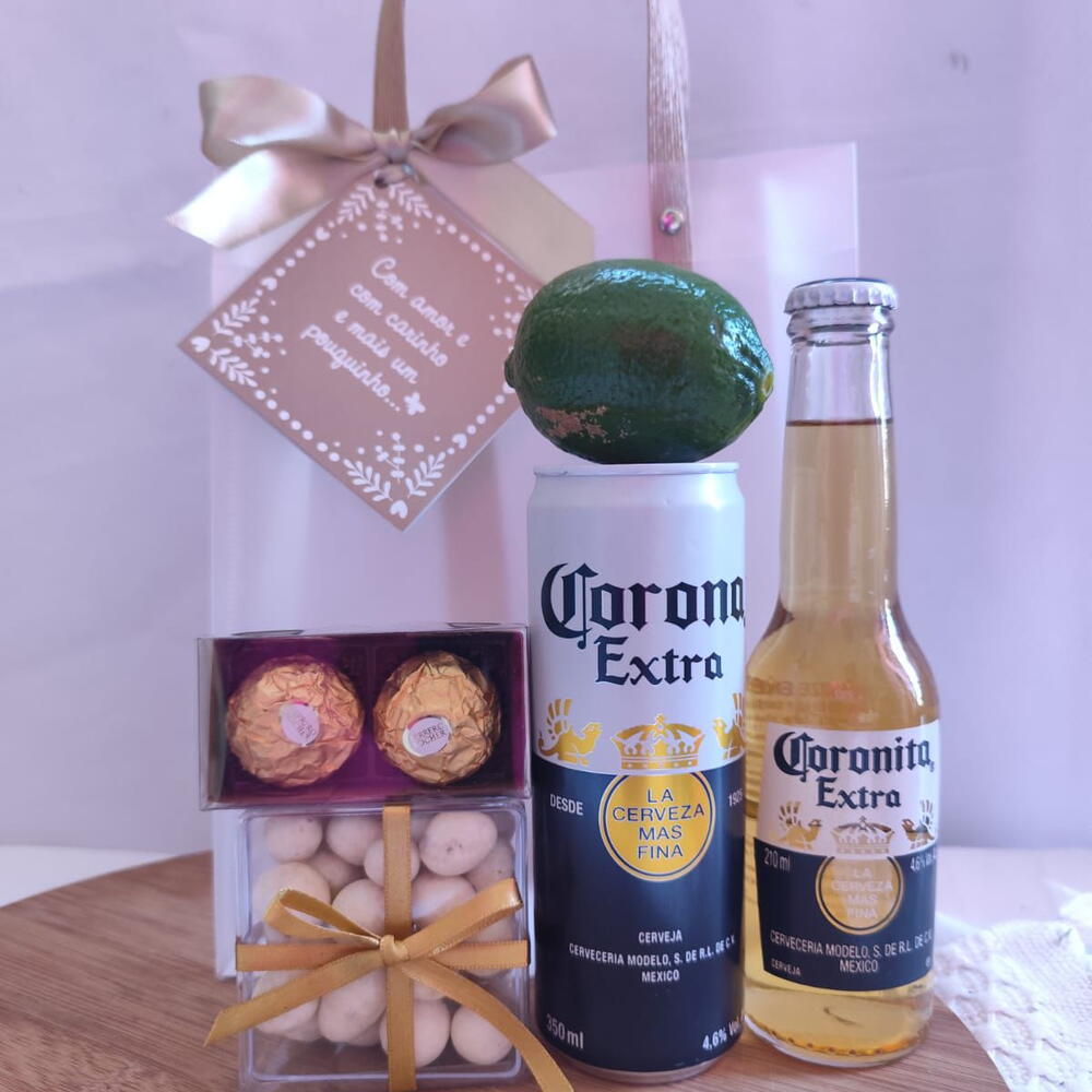 limão - 1 pcs coronita - 1 pcs lata de corona 350ml - 1 pcs sacola de plastico rigido e fosco com cartão e laço - 1 pcs porção de amendoins em caixinha de acrilicos - 1 pcs bombom ferrero rocher em caixinha de kraft - 2 pcs