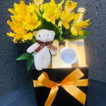 mini buquê de flores - 1 pcs uma caixa de papel rígido e laço de fita - 1 pcs caixa com 4 ferreros rocher - 1 pcs mini espumante 187 - 1 pcs mini chaveirinho em formato de ursinho - 1 pcs