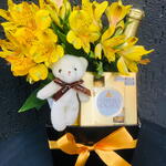 Surpreenda alguém especial com este charmoso Presente com Bebida! Acompanhado por uma elegante caixa de papel rígido, adornada com um laço de fita, este presente contém uma delicada seleção de mimos. Dentro, você encontrará um encantador mini buquê de flores, um conjunto de 4 Ferreros Rocher irresistíveis e um mini espumante de 187ml para brindar bons momentos. Além disso, um adorável mini chaveiro em formato de ursinho adiciona um toque extra de doçura a este conjunto genuinamente especial. Um presente perfeito para aniversários, datas comemorativas ou simplesmente para alegrar o dia de alguém.