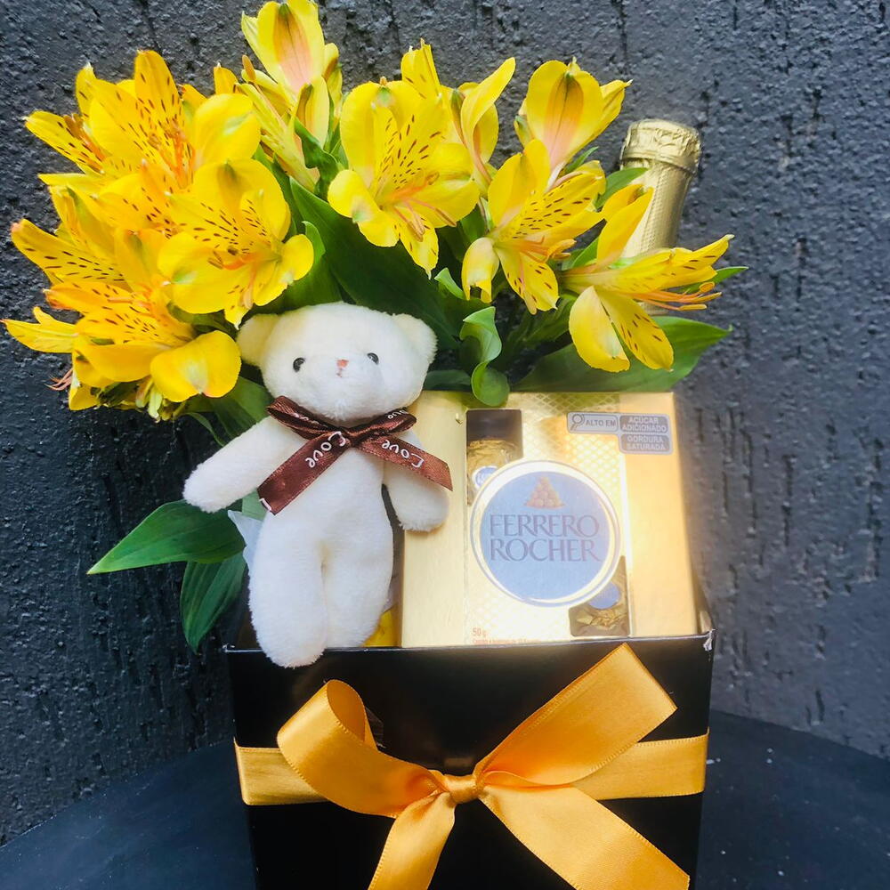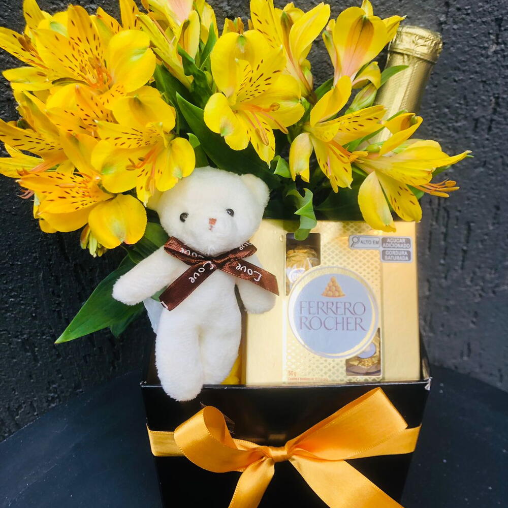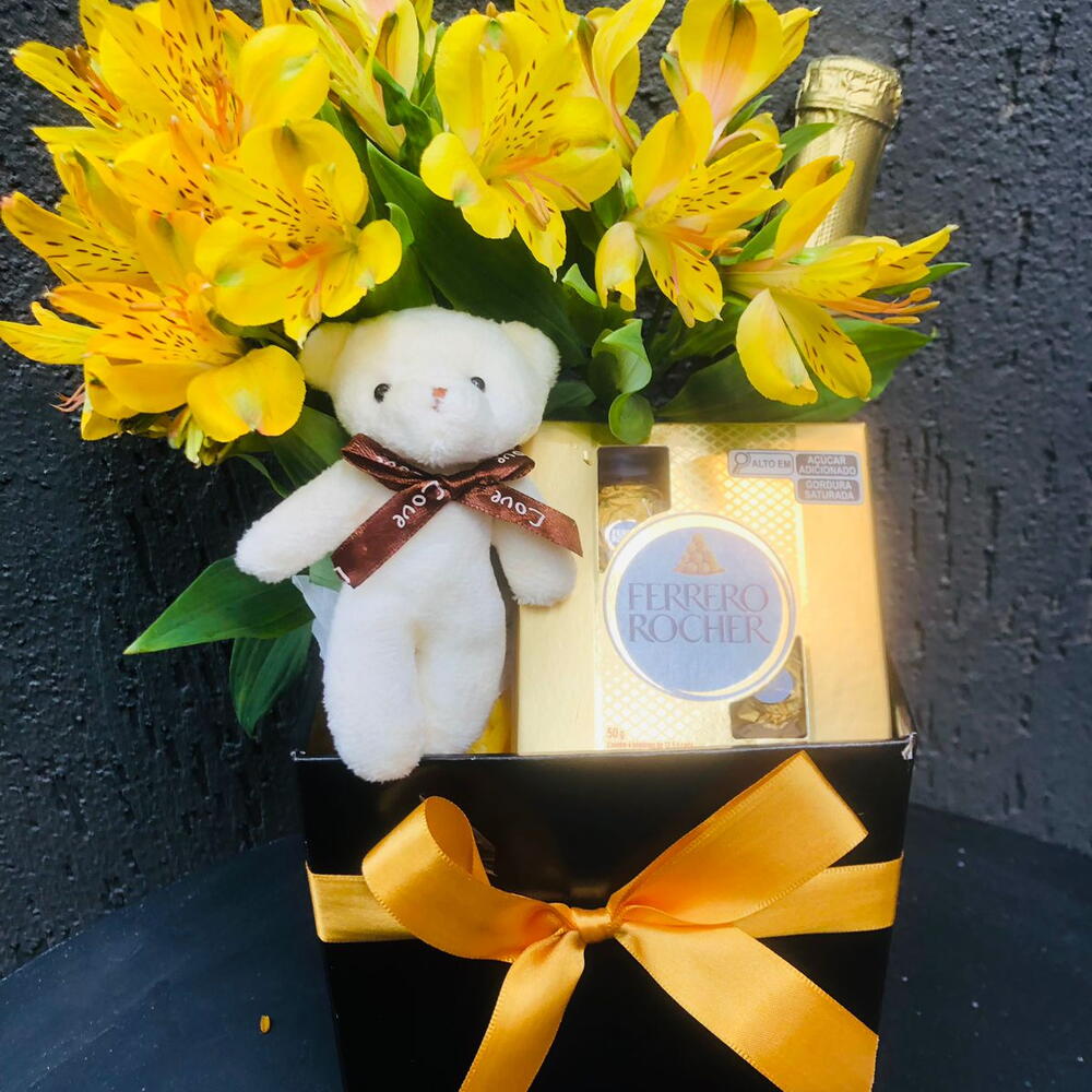 mini buquê de flores - 1 pcs uma caixa de papel rígido e laço de fita - 1 pcs caixa com 4 ferreros rocher - 1 pcs mini espumante 187 - 1 pcs mini chaveirinho em formato de ursinho - 1 pcs