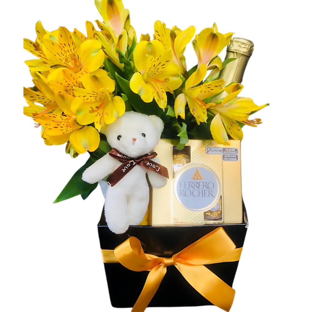 Surpreenda alguém especial com este charmoso Presente com Bebida! Acompanhado por uma elegante caixa de papel rígido, adornada com um laço de fita, este presente contém uma delicada seleção de mimos. Dentro, você encontrará um encantador mini buquê de flores, um conjunto de 4 Ferreros Rocher irresistíveis e um mini espumante de 187ml para brindar bons momentos. Além disso, um adorável mini chaveiro em formato de ursinho adiciona um toque extra de doçura a este conjunto genuinamente especial. Um presente perfeito para aniversários, datas comemorativas ou simplesmente para alegrar o dia de alguém.