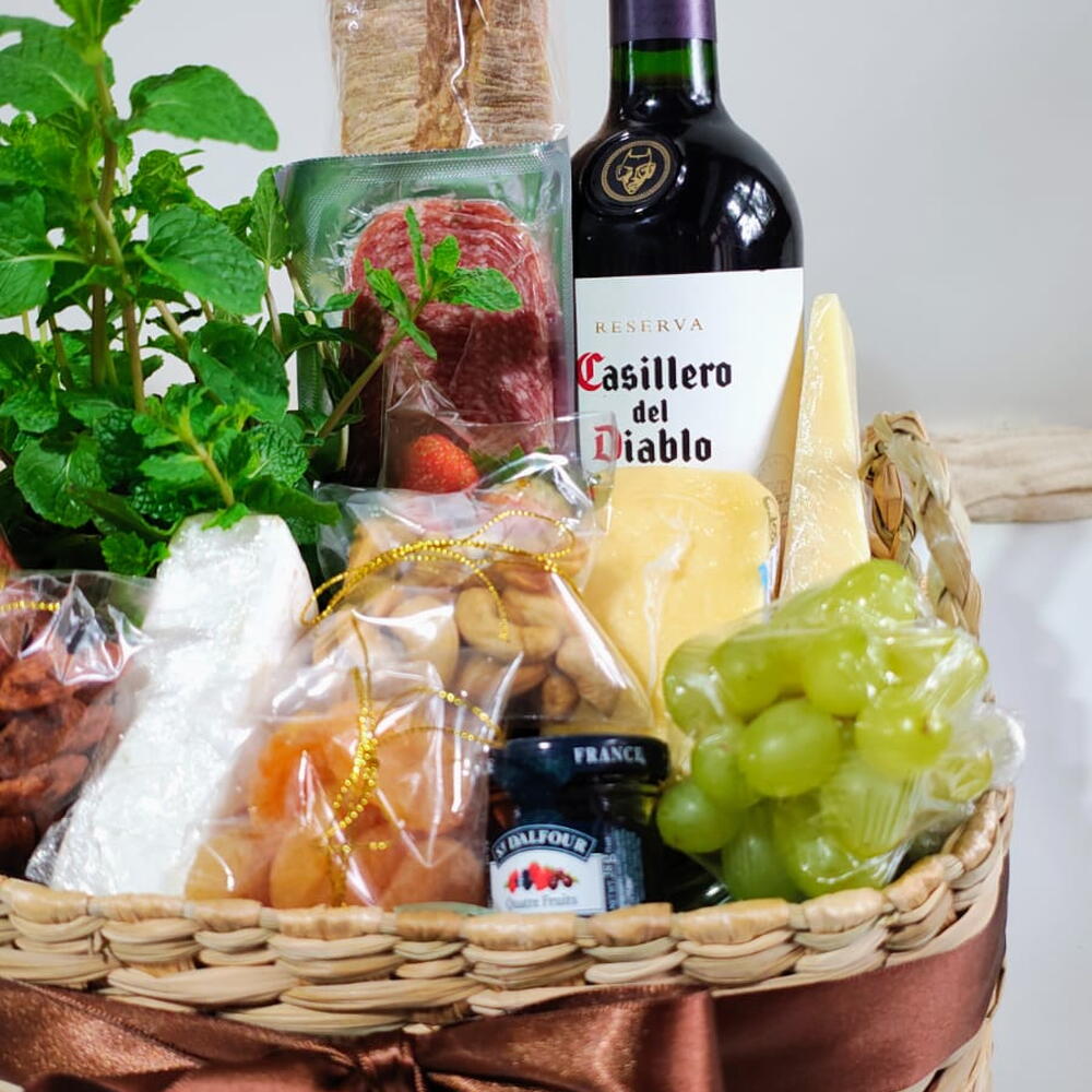 A Cesta Queijos e Vinhos é uma experiência gourmet pensada para surpreender com sabor e elegância. Composta por 1 baguete artesanal, 1 vinho premium entre: Casa Valduga, Casa Silva ou Casillero del Diablo, queijo gruyère, queijo brie, Queijo gouda, salame italiano, Presunto Parma ou Lombo Canadense, geleia francesa, pastinha salgada especial, porção de damascos e porção de amêndoas e castanhas, uvas sem sementes, morangos e um lindo vaso de temperos do dia. Em caso de agendamento pode ser enviado pelo chat a uva de preferencia entre merlot, cabernet ou chardonnay.