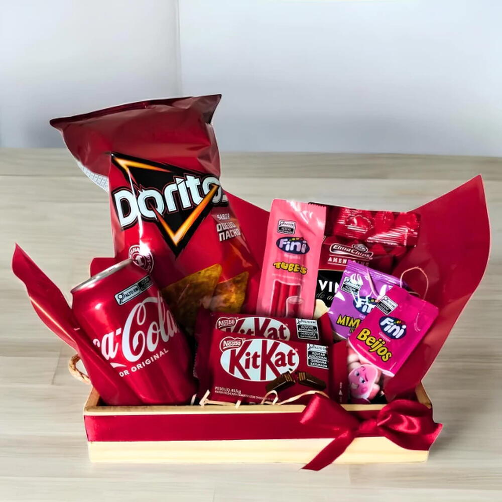 embalagem - 1 pcs laço - 1 pcs chocolates kitkat 41 - 2 pcs coca cola lata 350ml; - 1 pcs ovinhos de amendoim 145g; - 1 pcs fini sabores sortidos 15g; - 3 pcs - 1 bandeja de madeira decorada. - 1 pcs salgadinho doritos 120g - 1 pcs