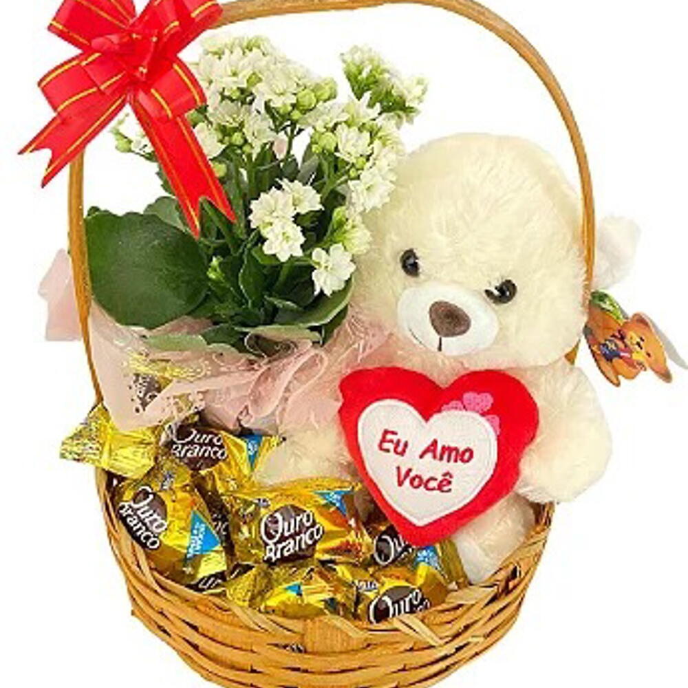 urso de pelúcia - 1 pcs bombons sonho de valsa - 6 pcs cesta decorada - 1 pcs arranjo de kalanchoe - 1 pcs