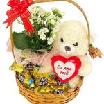 Surpreenda alguém especial com esta cesta de chocolate encantadora e repleta de surpresas doces! Ela contém uma cesta decorativa deslumbrante, um ursinho de pelúcia fofo para conquistar corações, um arranjo elegante de kalanchoe para adicionar um toque de frescura e seis bombons Sonho de Valsa, conhecidos pelo seu sabor inigualável. Perfeito para qualquer ocasião que requer algo extra especial.
