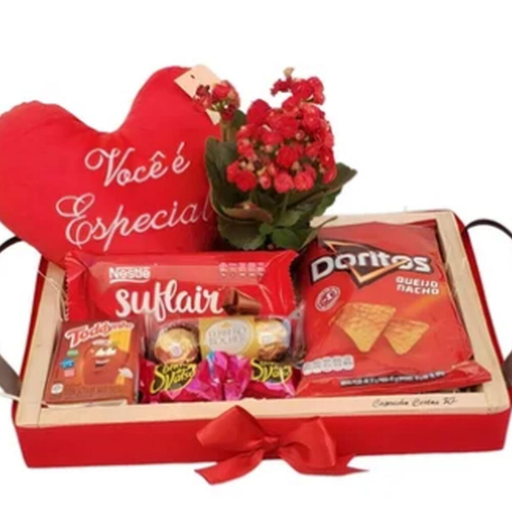 ferrero rocher - 3 pcs bombons - 2 pcs doritos - 1 pcs flor kalanchoe - 1 pcs coração de pelúcia - 1 pcs barra chocolate - 1 pcs bebida láctea - 1 pcs