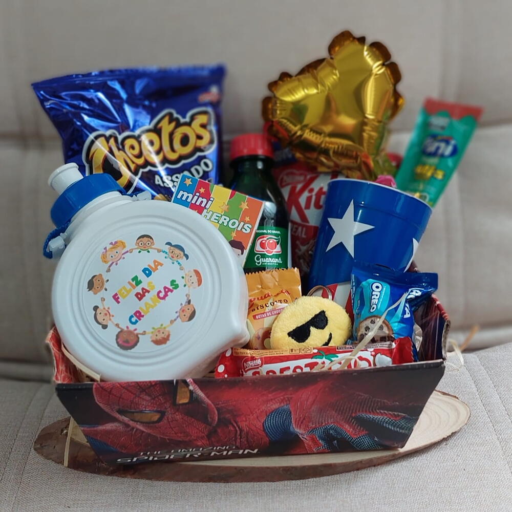 cheetos - 1 pcs pirulitos - 2 pcs guaraná 200ml - 1 pcs prestigio - 1 pcs bombom oreo - 1 pcs balão decorativo - 1 pcs chaveiro emoji - 1 pcs gomet iogurte - 1 pcs fini de 15g - 1 pcs biscoitinho bauducco - 1 pcs kit kat cereal - 1 pcs jogo da memória heróis - 1 pcs cantil de água - 1 pcs copo capitão america - 1 pcs