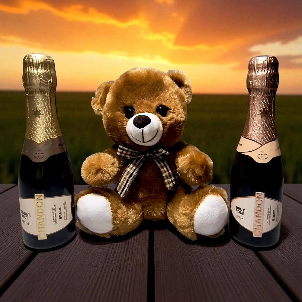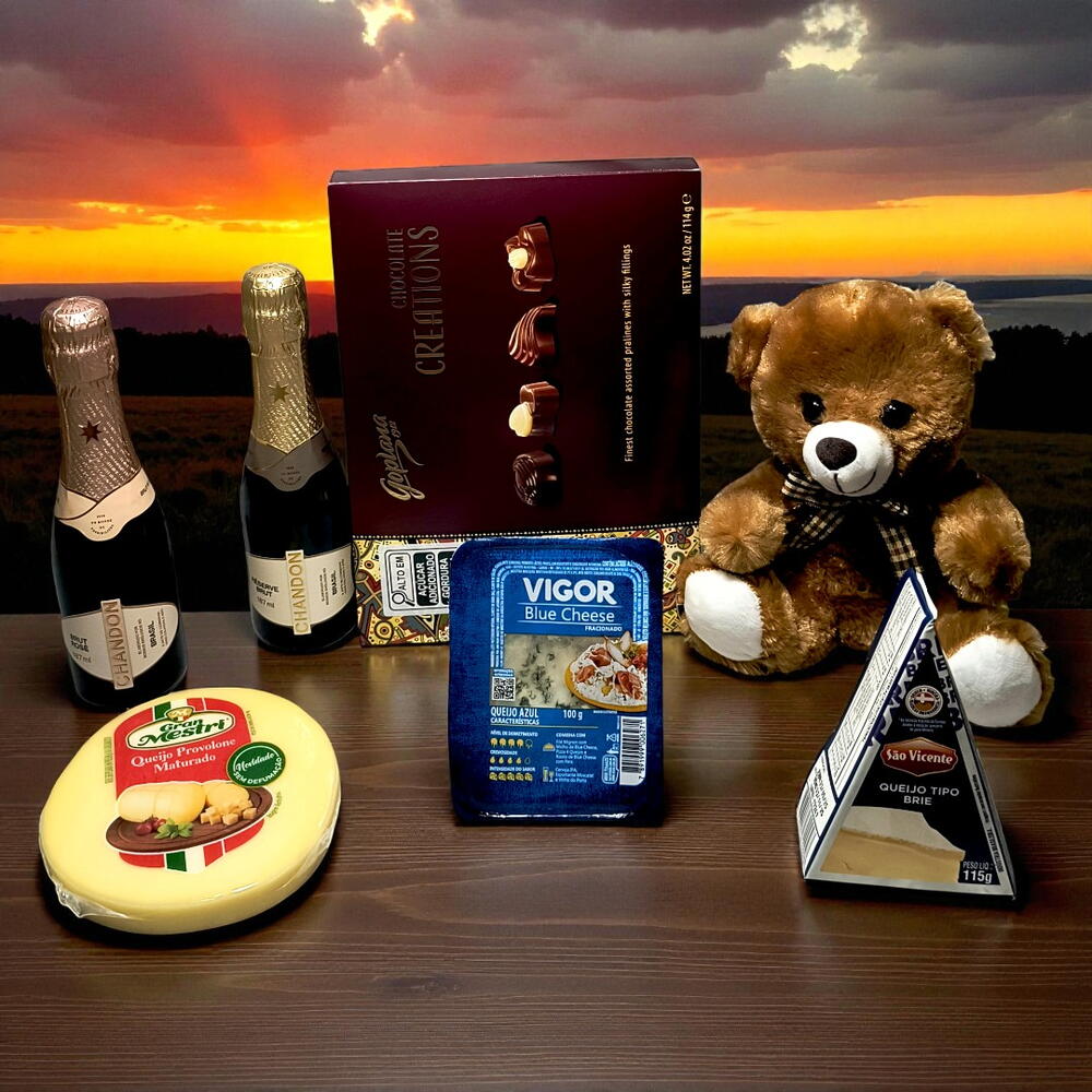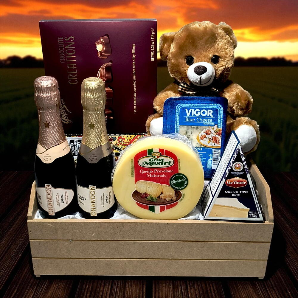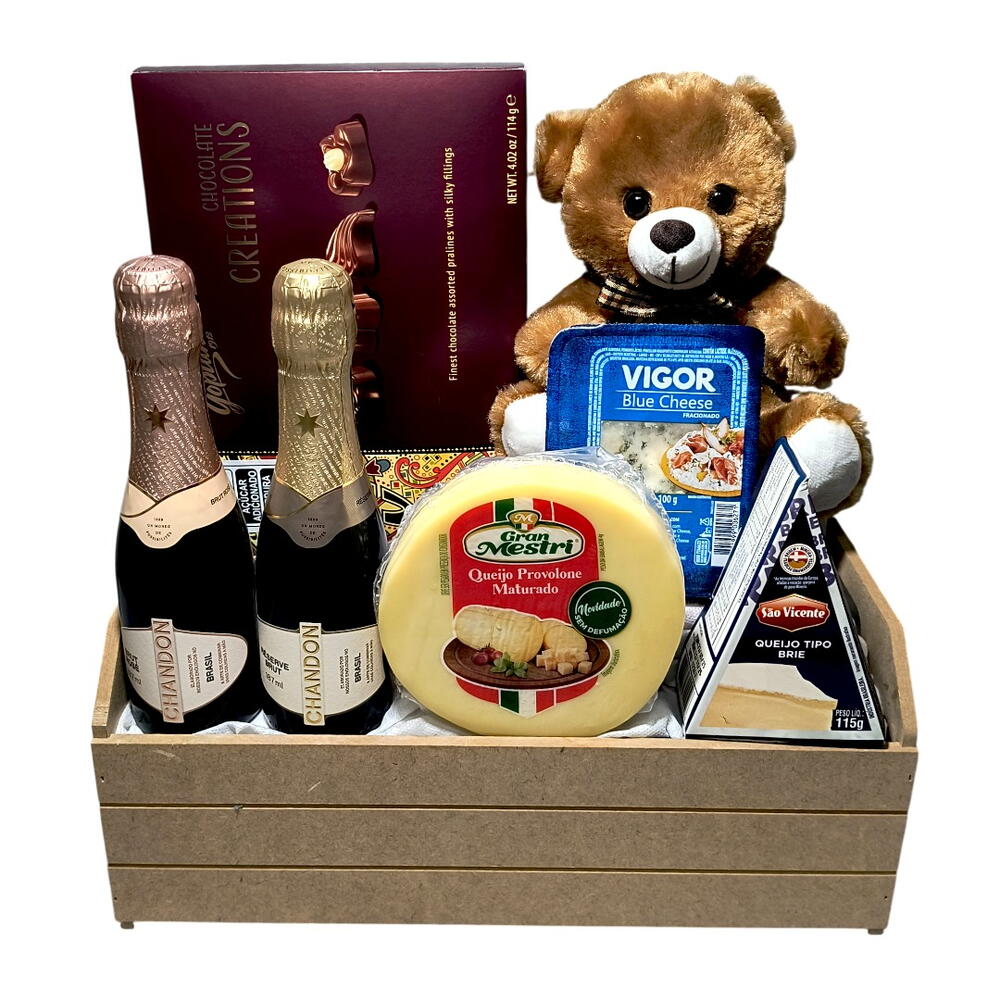 urso de pelúcia - 1 pcs caixa em mdf - 1 pcs espumante chandon brut rose 187 ml - 1 pcs queijo tipo gorgonzola 100 g - 1 pcs queijo tipo brie 115 g - 1 pcs queijo tipo provolone maturado 215 g - 1 pcs celofane + laço - 1 pcs espumante chandon reserve brut branco 187 ml - 1 pcs caixa de bombom de chocolate polonês 114g - 1 pcs