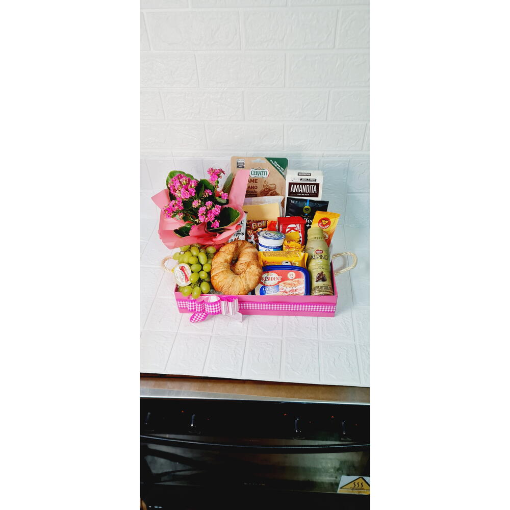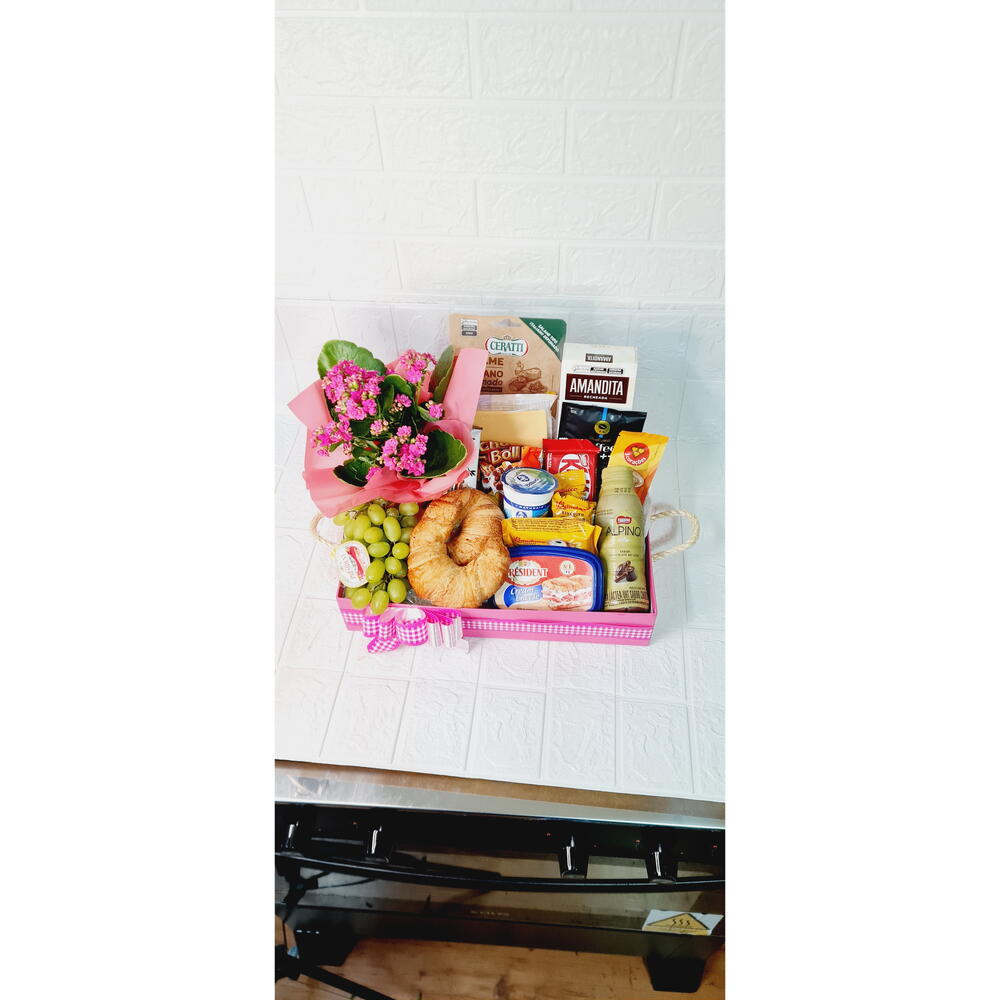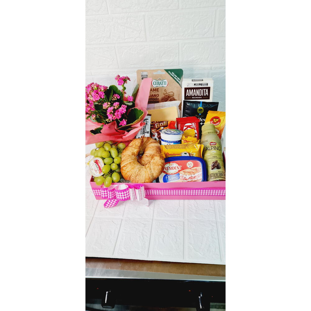 Cesta de Café da Manhã: composta por croissants, torradas, Kit Kat, suco, uvas, manteiga, Sucrilhos, achocolatado, queijo e presunto, café, biscoitos doces, flor plantada e sachê de geleia. Uma seleção de delícias para começar o dia com sabor e energia.
