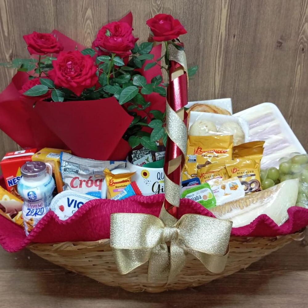 celofane - 1 pcs iogurte - 1 pcs caneca - 1 pcs pão de mel - 1 pcs capuccino - 1 pcs chá sachê - 1 pcs sucrilhos 30g - 1 pcs bolinho bauduco - 1 pcs clube social - 1 pcs torrada bauduco - 1 pcs 3g - 1 pcs laço decorativo - 1 pcs arranjo com 3 rosa vermelhas - 1 pcs sachê açúcar - 3 pcs sachê adoçante - 2 pcs suco dell vale 200ml - 1 pcs 100g de frios - 1 pcs 3 tipos de pães - 1 pcs 2 tipos de frutas - 1 pcs margarina sachê - 2 pcs torrada bauduco integral - 1 pcs wafer/bolinho - 1 pcs biscoito bauduco cream cracker - 2 pcs biscoito bauduco doce - 4 pcs guloseima - 1 pcs barra de chocolate bauduco - 1 pcs barra goiabinha bauduco - 1 pcs café granulado - 1 pcs achocolatado nescau 200ml - 1 pcs biscoito bauduco maisena - 1 pcs