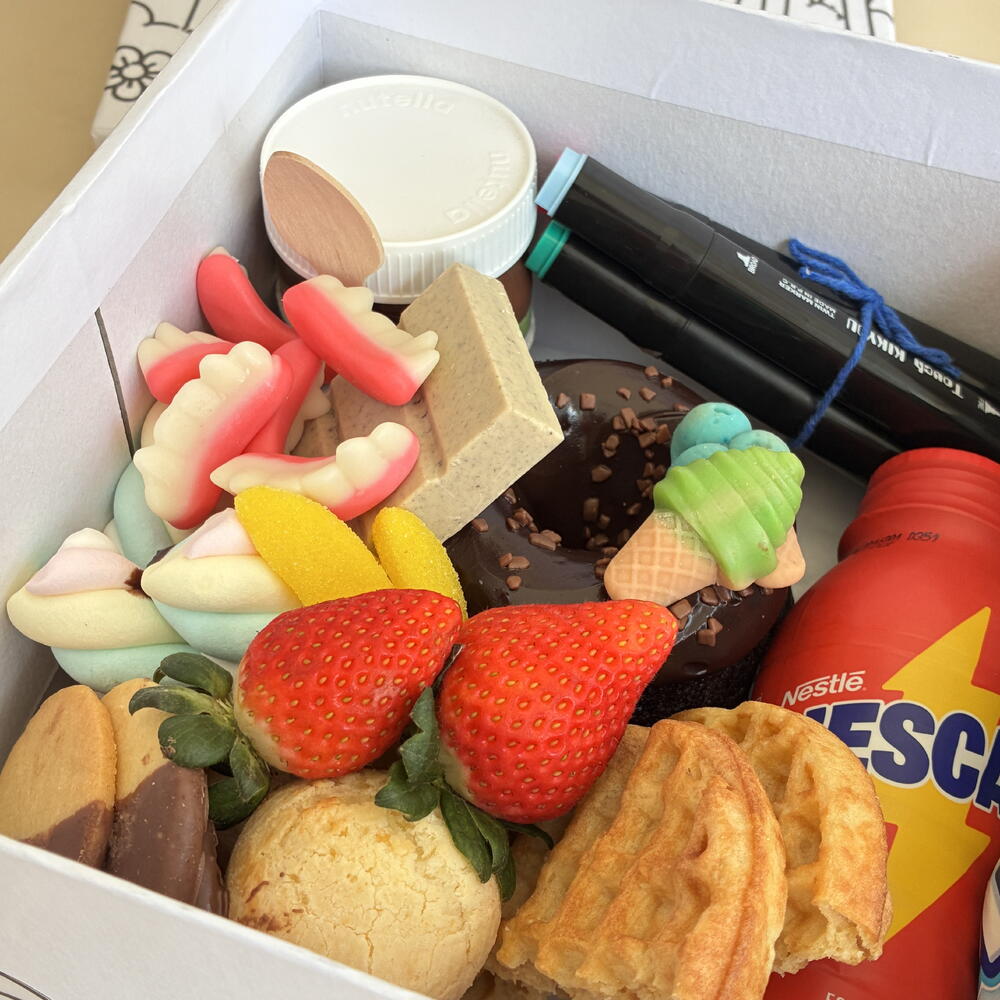 pão de queijo - 3 pcs waffle - 1 pcs morango - 2 pcs bolo de chocolate - 1 pcs nutella b ready - 1 pcs nescau - 1 pcs balas fini - 2 pcs nutella 140 g - 1 pcs mini oreo - 1 pcs caixa cartonada quadrada - 1 pcs marshmallow coloridos - 5 pcs caneta colorida - 4 pcs petit four com chocolate - 3 pcs