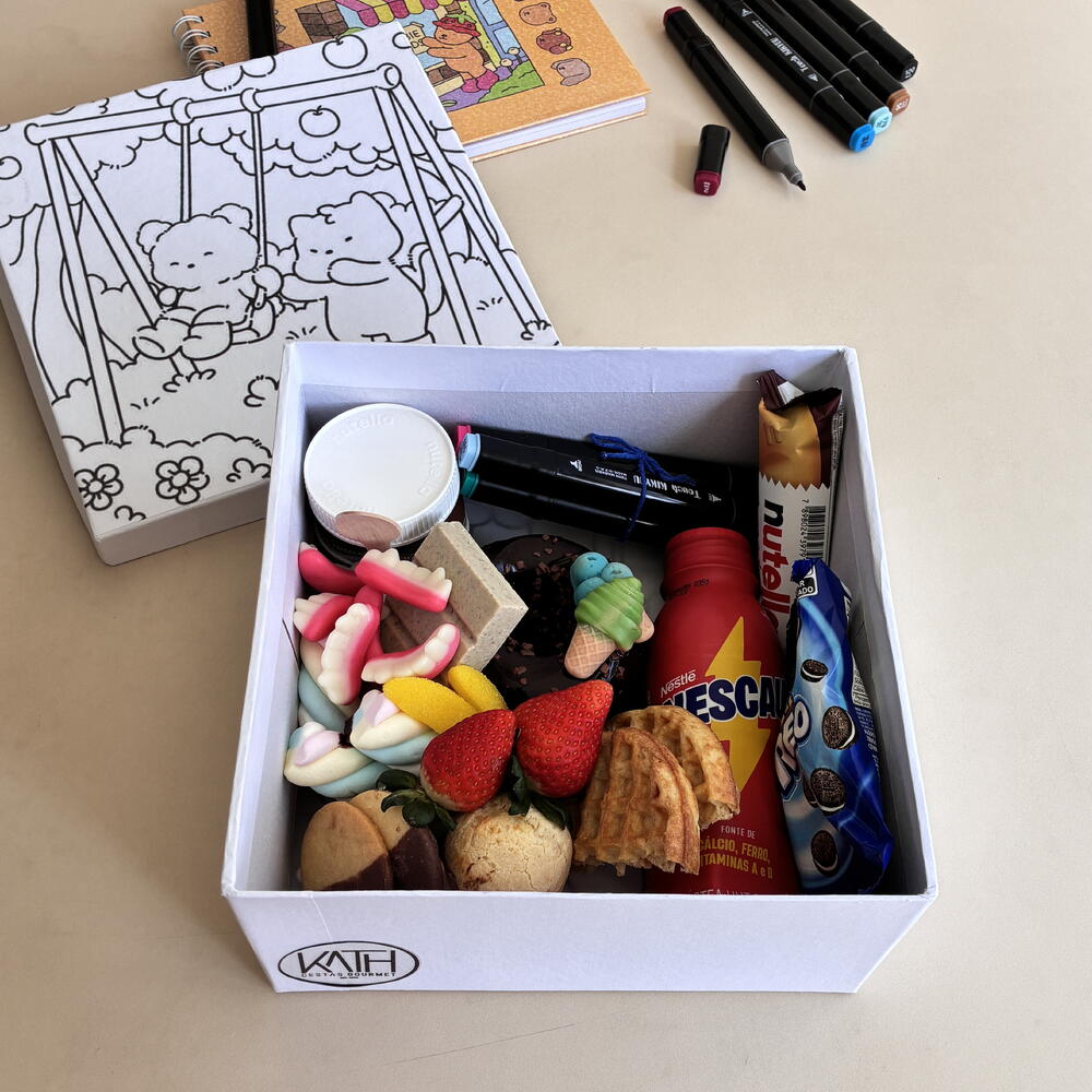 Encante-se com nossa Cesta Infantil! Este presente cheio de surpresas está repleto de delicias para satisfazer os gostos mais doces. A cesta inclui uma unidade de delicioso waffle, duas unidades de irresistível morango, um bolo de chocolate caseiro. Alé disso, contém uma unidade de Nutella B ready para adicionar aquele toque especial, acompanhado de Nescau para deixar tudo ainda melhor. Para completar, temos duas unidades de balas Fini, uma unidade de Nutella de 140g, uma embalagem de Mini Oreo, cinco unidades de marshmallows coloridos e três pães de queijo com catupiry. E não para por aqui, temos quatro canetas coloridas para os pequenos artistas e três petit fours com chocolate para um mimo a mais. Tudo isso embalado em uma caixa quadrada de cartão cuidadosamente selecionada. Esta cesta é a mistura perfeita de sabores e diversão, um presente maravilhoso para qualquer ocasião.