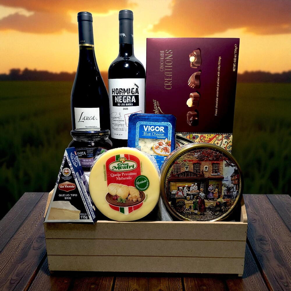 caixa de mdf - 1 pcs queijo tipo gorgonzola 100 g - 1 pcs queijo tipo brie 115 g - 1 pcs vinho fino tinto seco pinor noir chile valle de maule 750 ml lauca - 1 pcs vinho fino tinto seco hormiga negra malbec argentino 750 ml - 1 pcs geleia de amora linea 230 g - 1 pcs queijo tipo provolone maturado 215 g - 1 pcs lata com biscoitos amanteigados 150 g - 1 pcs celofane + laço - 1 pcs caixa com bombons de chocolate polonês 114 g - 1 pcs