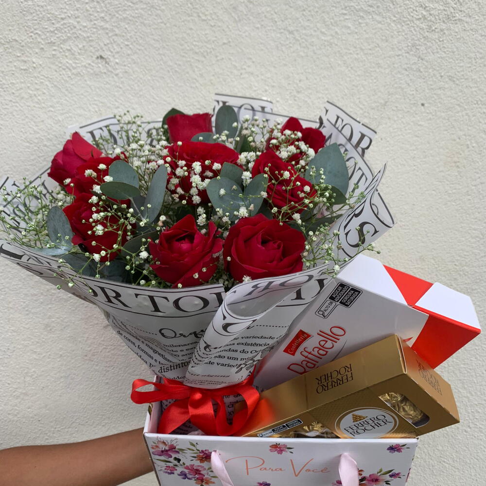 rafaello bombom - 1 pcs ferrero rocher caixa c8 unidades - 1 pcs buquê com rosa vermelhas - 1 pcs