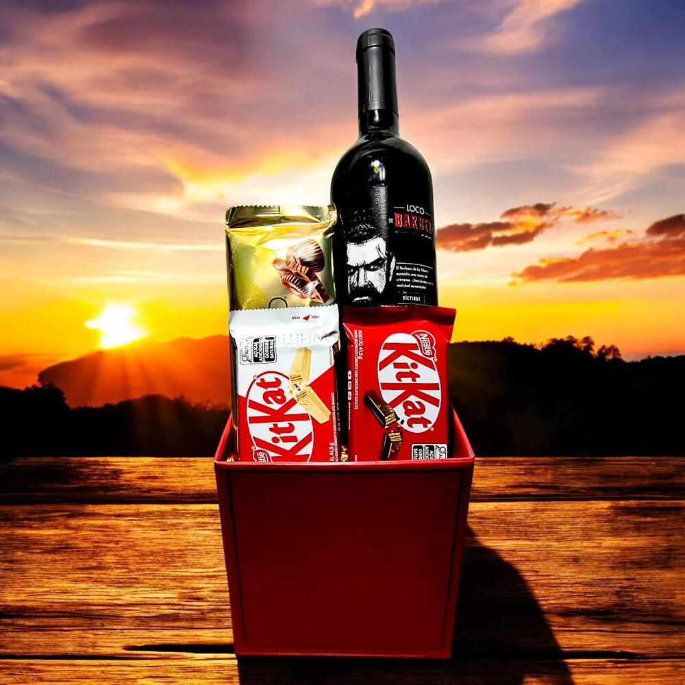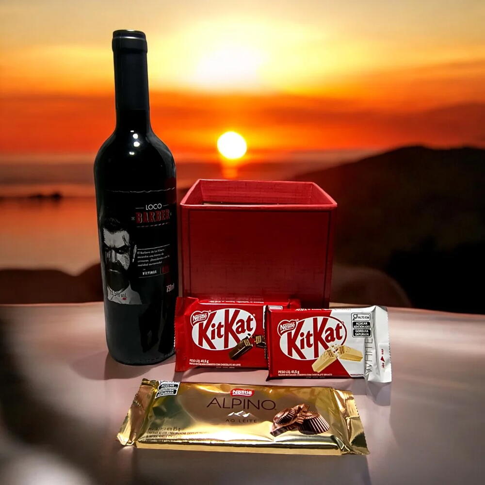 celofane e laço - 1 pcs vinho fino tinto meio seco espanhol loco barber uva barbera 750 ml - 1 pcs chocolate alpino ao leite 85 g nestle - 1 pcs caixa em cartonagem - 1 pcs chocolate kitkat branco 41 g - 1 pcs chocolate kitkat ao leite 41 g - 1 pcs