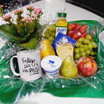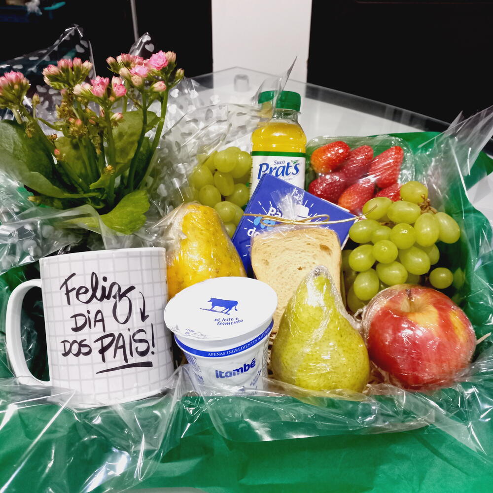 caneca - 1 pcs pera - 1 pcs torrada - 3 pcs iogurte natural - 1 pcs maçã vermelha - 1 pcs garrafinha de suco de laranja - 1 pcs morango bandeja - 1 pcs sache de chá - 1 pcs kalanchoe (cor pode sofrer alteração) - 1 pcs mamão inteiro - 1 pcs uva (cacho) - 2 pcs