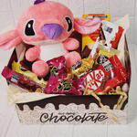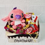 Esta bela cesta infantil é o presente perfeito para qualquer criança. Contém uma variedade de delícias, incluindo 6 unidades de bombons Lacta para satisfazer o seu doce desejo, uma caixa de papelão prática para guardar tesouros preciosos, um adorável boneco Stitch rosa que com certeza será o novo amigo favorito, uma deliciosa barra de Kit Kat Kinder Bueno para aquele momento especial de indulgência e uma luxuosa barra de chocolate Brasil Cacau 90 para um gostinho gourmet. Esta cesta oferece um punhado de alegria e felicidade em cada detalhe!