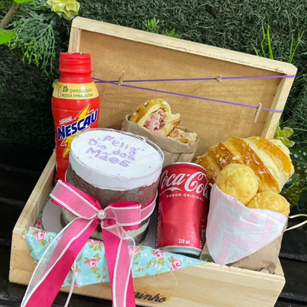 achocolatado - 1 pcs pães de queijo - 1 pcs paes de frios - 1 pcs coca. - 1 pcs caixote em mdf - 1 pcs tecido decorativo - 1 pcs croassan - 1 pcs bolo cake - 1 pcs