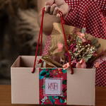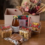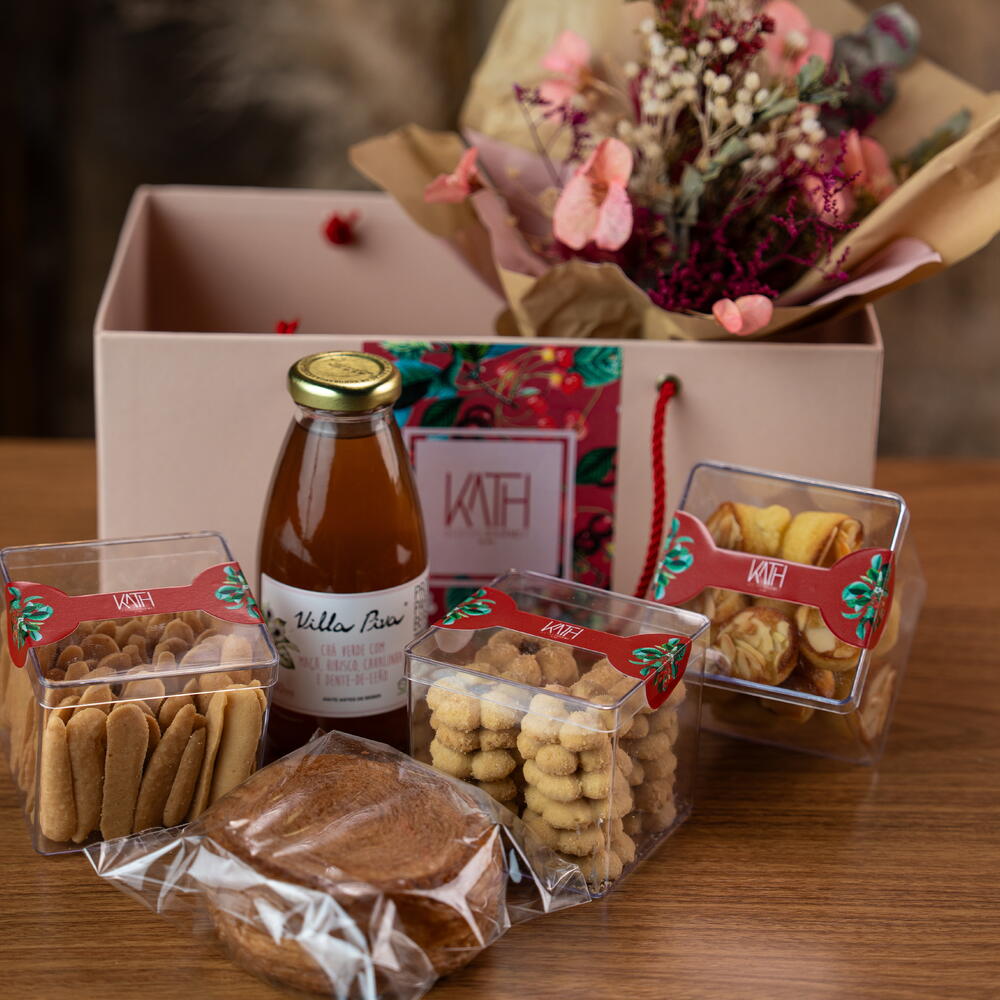 caixa cartonada retangular com alças - 1 pcs chá villa piva - 1 pcs cx de acrilico 8x8 com pétit four amanteigado - 1 pcs cx de acrílico 8x8 com pétit língua de gato - 1 pcs cx de acrílico 8x8 com financie - 1 pcs buquê de flores desidratadas com embalagem - 1 pcs