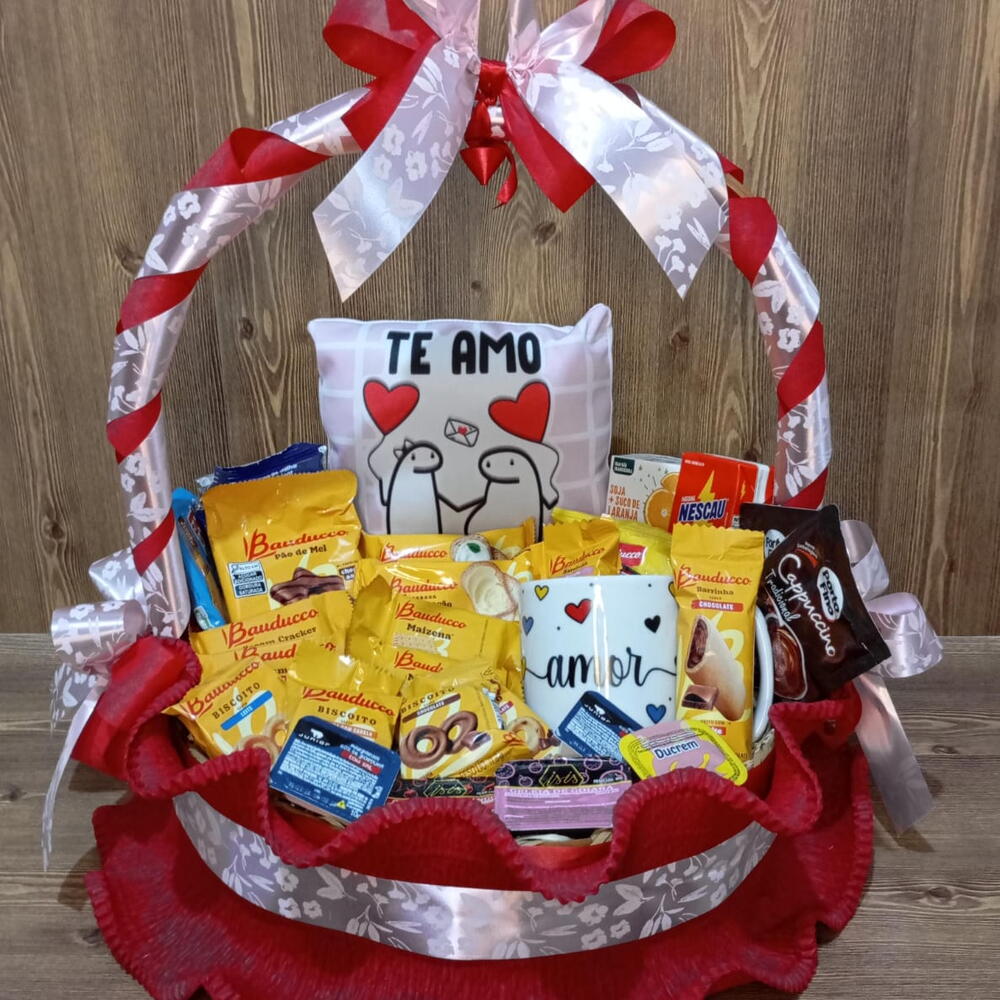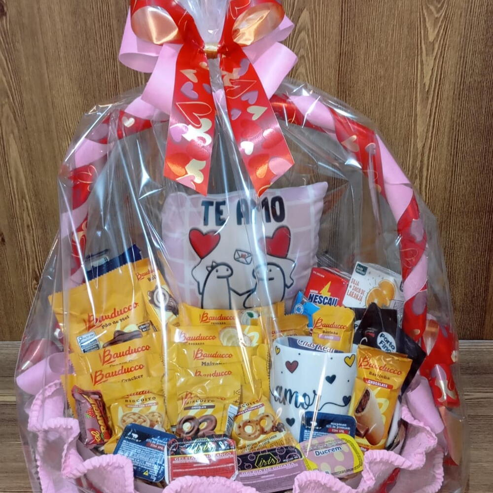Desfrute do prazer de um café da manhã repleto de delícias com a Cesta de Café da Manhã. Composta por uma almofada personalizada e uma elegante caneca, esta cesta traz uma seleção incrível de itens para fazer da sua manhã a mais saborosa. Apresenta um mix de torradas da Bauducco, integral e tradicional, wafers e bolinhos Bauducco deliciosos, diferentes tipos de biscoitos Bauducco incluindo cream cracker e maisena, e uma seleção de capuccino, chá, café e suco para sua escolha de bebida. Além disso, inclui a opção mais doce com chocolates Bauducco, goiabinhas, um delicioso pão de mel e outros doces. Todos embalados de forma atraente em celofane, completos com um laço decorativo. Comece o dia com um deleite.