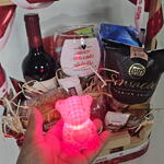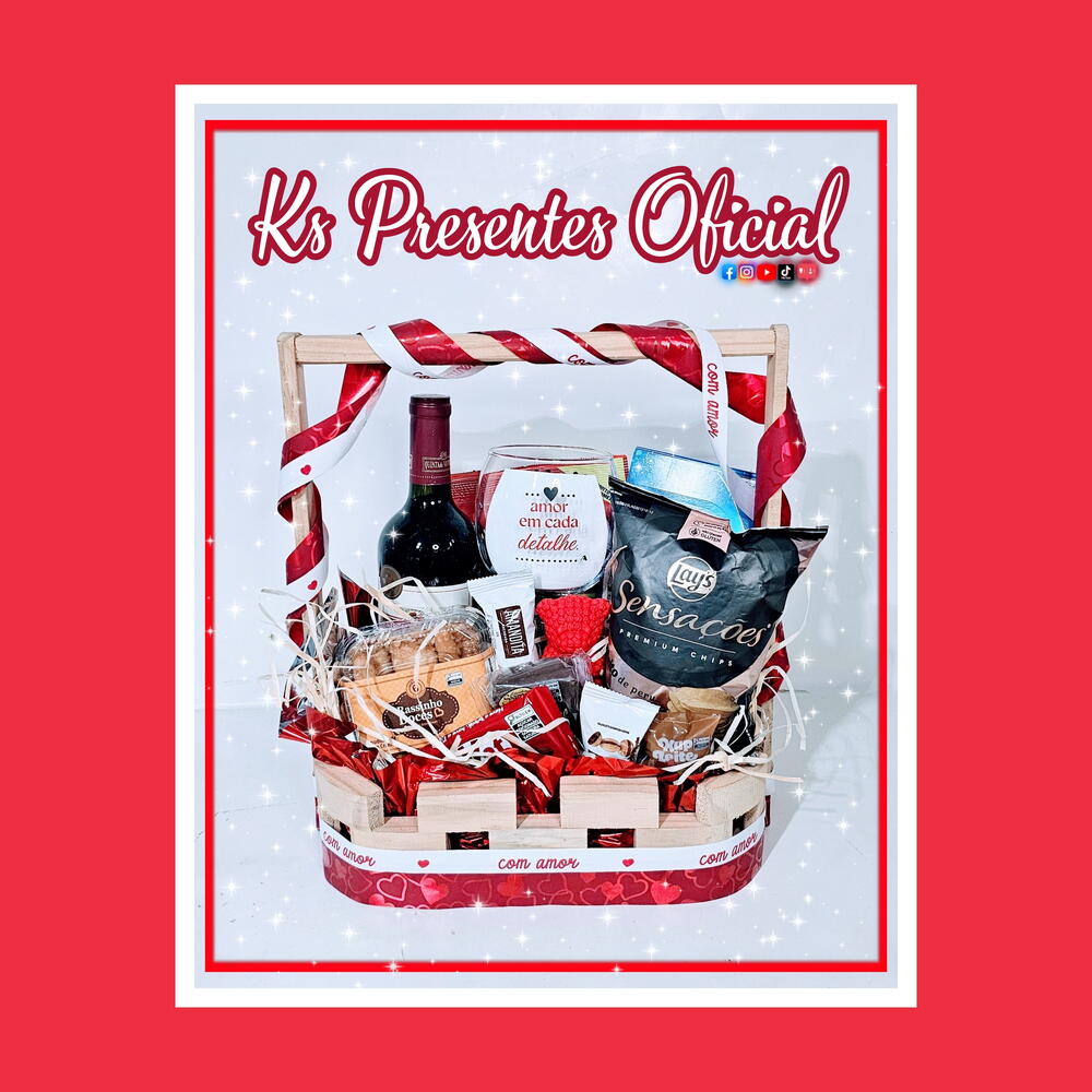 pão de mel - 1 pcs cesta madeira - 1 pcs bombons lacta - 15 pcs taça personalizada - 1 pcs bisnaga doce de leite - 1 pcs pacote sensação premium - 1 pcs vinho tinto quinta do morgado - 1 pcs caixa rassinho doces cone recheado - 1 pcs barra kit kat tradicional - 1 pcs bombons amandita - 2 pcs urso luminoso - 1 pcs pacote jack link's pururuca - 1 pcs