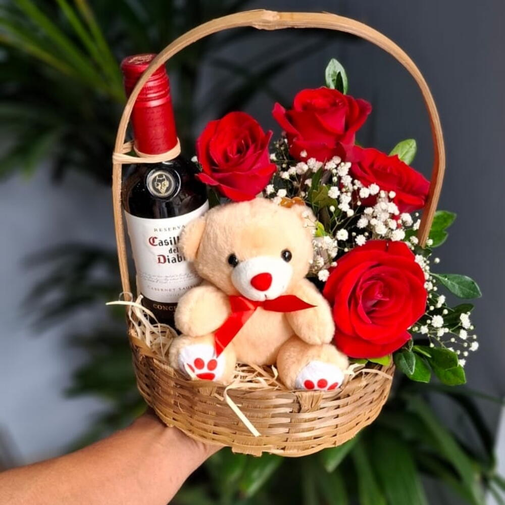 Cesta de bambu composta com uma Pelúcia pequena, Vinho Casillero Del Diablo Cabernet Sauvignon 375 ml e um lindo arranjo com 4 rosas vermelhas.