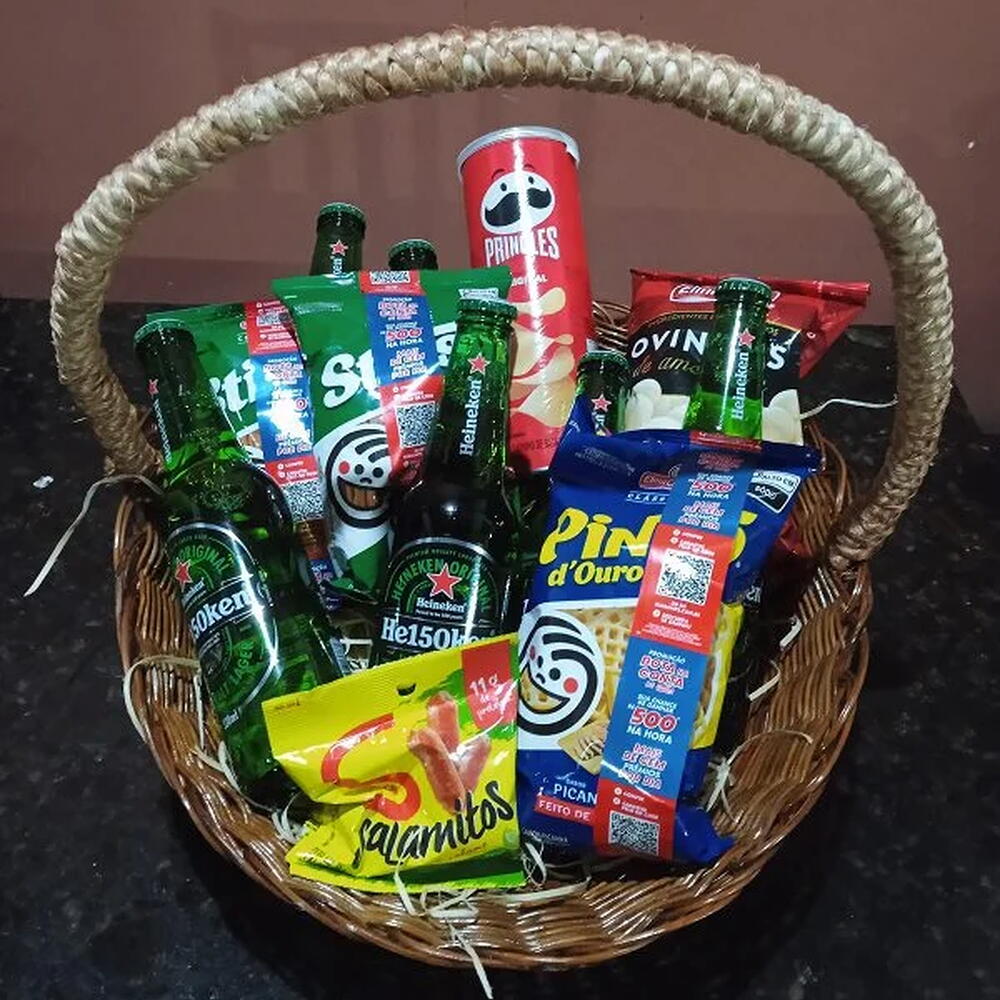 Este presente combina a alegria de uma celebração animada com a satisfação dos petiscos saborosos. Inclui um irresistível e crocante ovinho de amendoim, um saboroso salamito para aprimorar o paladar, tudo servido em uma cesta rústica de estilo autêntico. Para desfrutar, oferecemos cinco refrescantes cervejas Heineken Long Neck, perfeitas para criar memórias inesquecíveis. Por fim, aprecie nossas batatas fritas Pringles, Sticks, e salgadinhos Pingo de Ouro. Com certeza, este presente vai deliciar e impressionar qualquer pessoa.