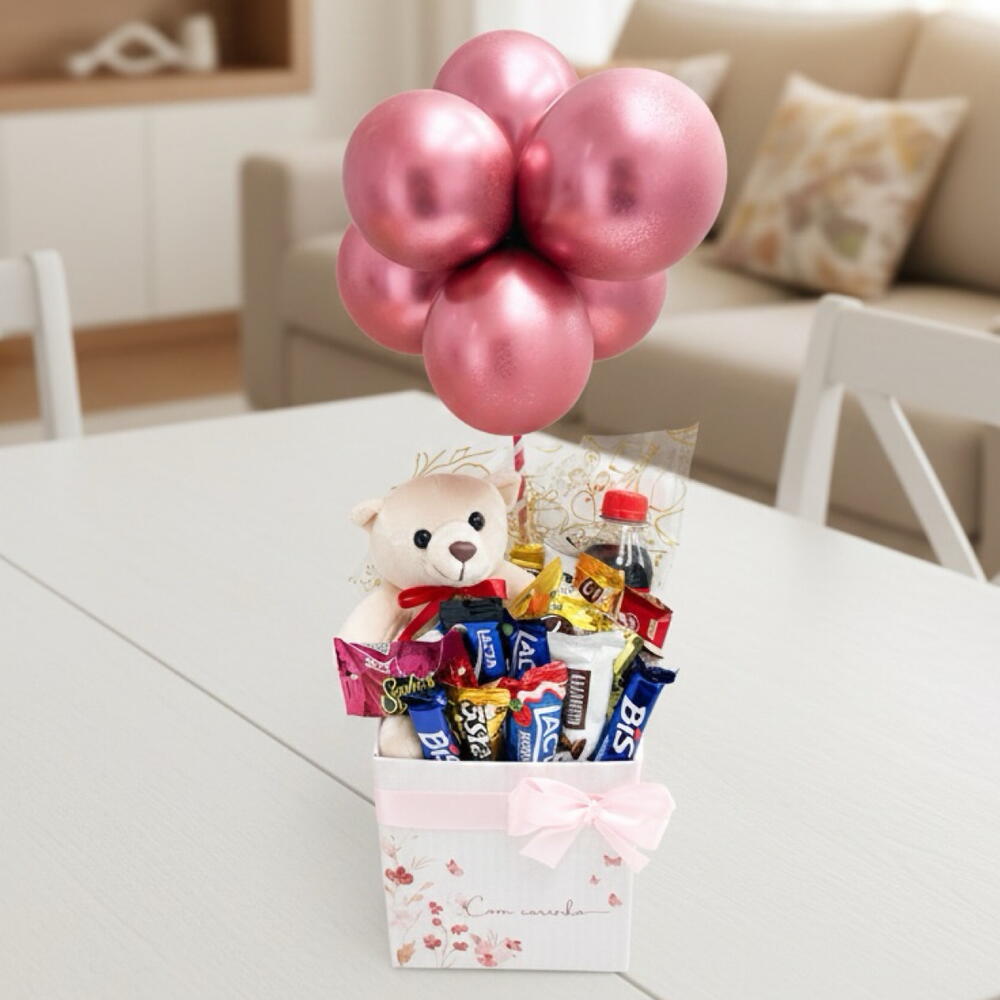 Esta encantadora Cesta de Chocolate vem recheada de doçuras e surpresas. Oferece harmoniosamente um total de 11 unidades de mix de chocolates, cuidadosamente selecionados para cativar o paladar dos amantes de chocolates. Adicionalmente, a cesta inclui um adorável ursinho de pelúcia de 17cm, perfeito para transmitir o carinho e a ternura que coloca no presente. E para dar o toque final, um balão é adicionado, complementando o aspecto lúdico e festivo deste presente. É a escolha ideal para todas as ocasiões, desde aniversários até momentos especiais que merecem ser celebrados.