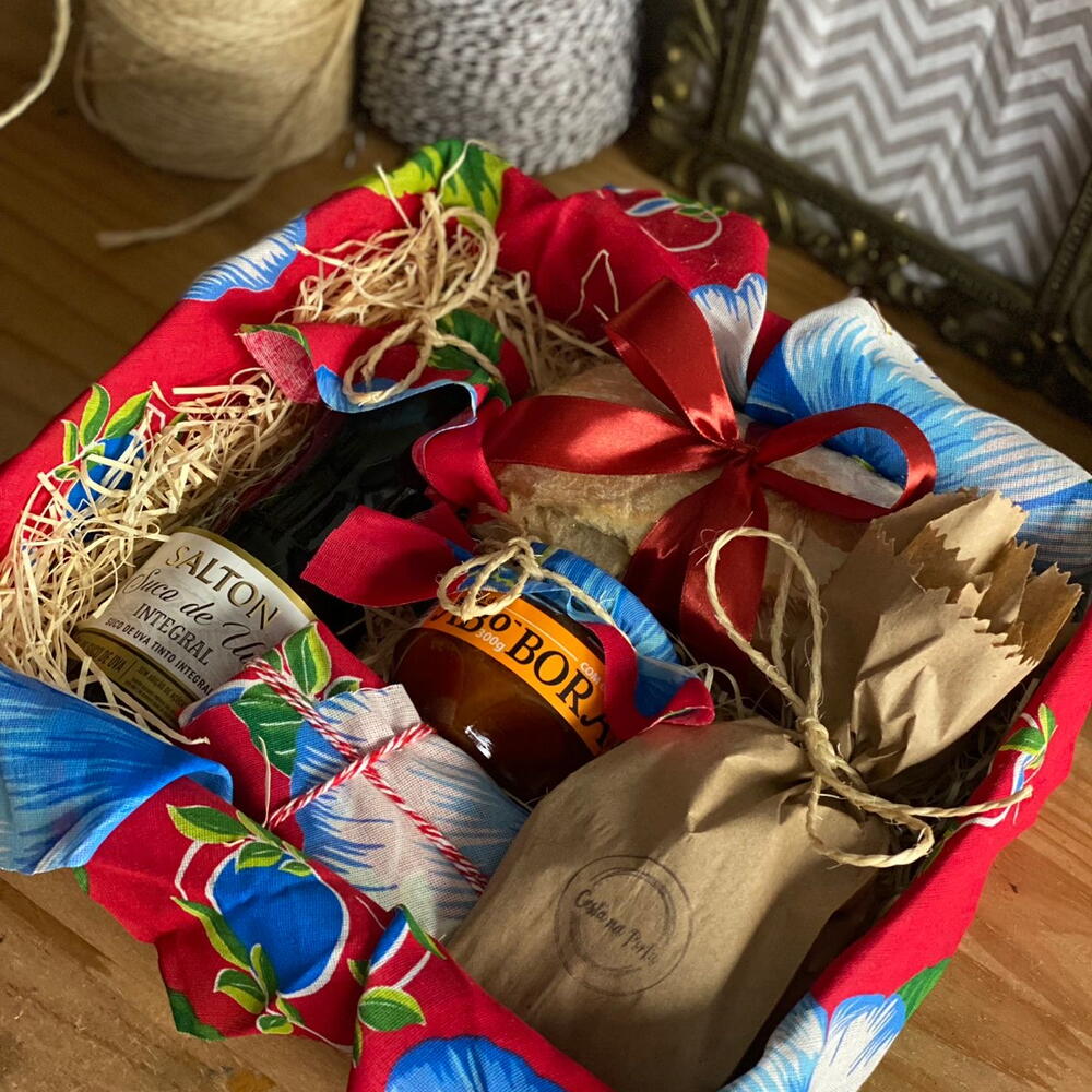 cesta - 1 pcs salame - 1 pcs geléia - 1 pcs suco de uva integral - 1 pcs pão caseiro - 1 pcs queijo colonial - 1 pcs palha decorativa - 1 pcs laço rústico - 1 pcs laço em cetim - 1 pcs tecido decorativo - 1 pcs