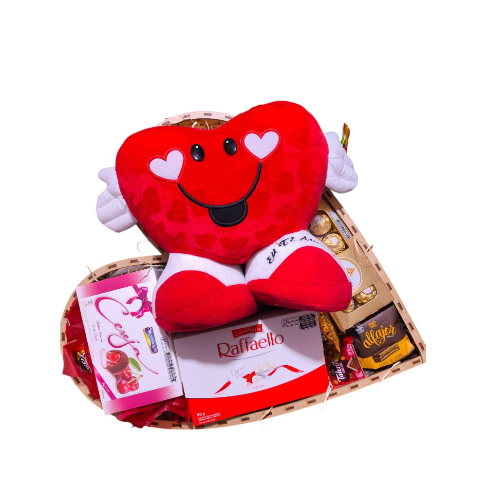 bombons - 2 pcs talento - 1 pcs alfajor - 1 pcs caixa de ferrero rocher - 1 pcs pelucia coração - 1 pcs raffaello - 1 pcs cesta coração decorada - 1 pcs montevergine cereja - 1 pcs