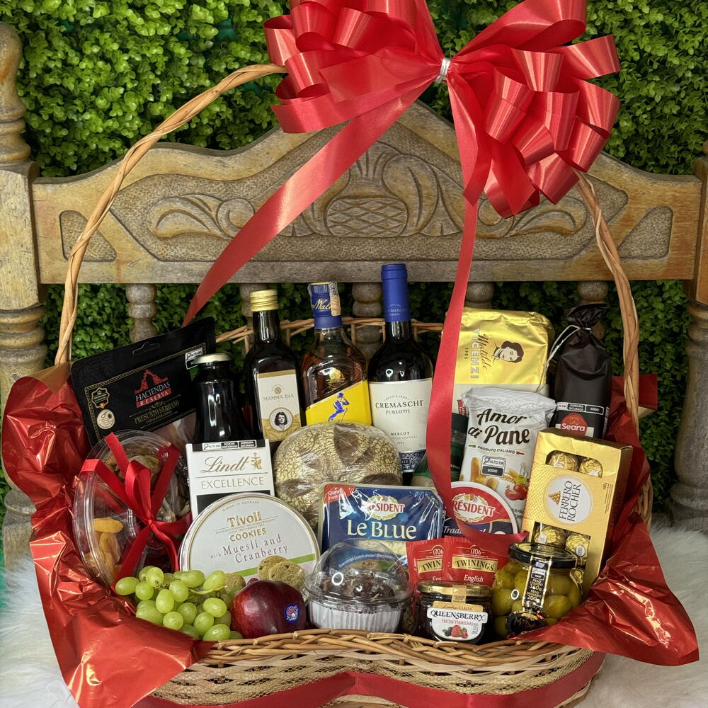 pão australiano - 1 pcs ferrero rocher 100gr - 1 pcs salame italiano (aprox. 200g) - 1 pcs vinho chileno 750ml - 1 pcs maçã importada - 1 pcs geleia queensberry 320g - 1 pcs tortelete - 1 pcs grissini amor de pane; - 1 pcs cesta de vime com embalagem decorativa e laço artesanal - 1 pcs queijo president tradicional - 1 pcs frappuccino starbucks 280ml - 1 pcs uvas selecionadas sem sementes - 1 pcs suco uva integral garibaldi 500ml - 1 pcs whisky johnnie walker blonde - 1 pcs presunto serrano 100gr reserva - 1 pcs mix com castanhas e frutas cristalizadas aproximadamente 250gr - 1 pcs cookies tivoli baked denmark - 1 pcs chocolate lindt 70% suíço - 1 pcs queijo president le blue - 1 pcs azeite mamma bia - 1 pcs chá twings 10gr - 2 pcs azeitonas gregas midas 200gr - 1 pcs folhado matilde vicenzi millefoglie italiano - 1 pcs