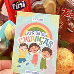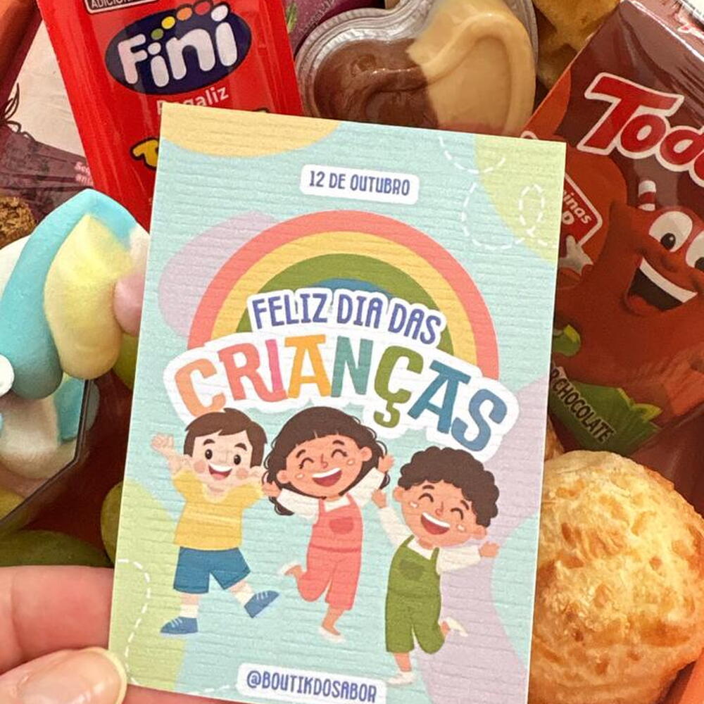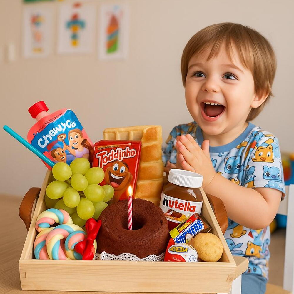 Bandeja de madeira 30x20cm com alça de couro marrom que pode ser usada depois Toddynho de chocolate Nutella 140g Chamyto go yogurte Kinder Joy Pão de leite fofinho MMs Waffle americana Coração com creminho napolitano Uvas sem semente Marshmallows fini torção Fini Colherzinha de madeira Tag de Feliz Dia das Crianças A cesta já vai embalada pronta para presentear, com laço e tag. çasçaçasças
