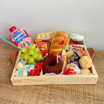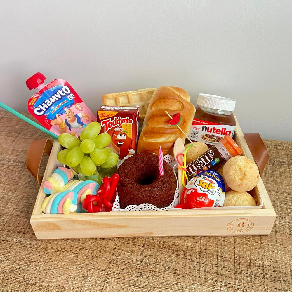 laço - 1 pcs pão de leite fofinho - 1 pcs mini pão de queijo - 1 pcs fini - 1 pcs nutella 140g - 1 pcs mms - 1 pcs saco celofane transparente - 1 pcs kinder joy - 1 pcs uvas sem semente - 1 pcs waffle americana - 1 pcs bandeja de madeira 30x20cm com alça de couro - 1 pcs potinho com creminho napolitano - 1 pcs toddynho de chocolate - 1 pcs chamyto para beber - 1 pcs marshmallows fini - 1 pcs