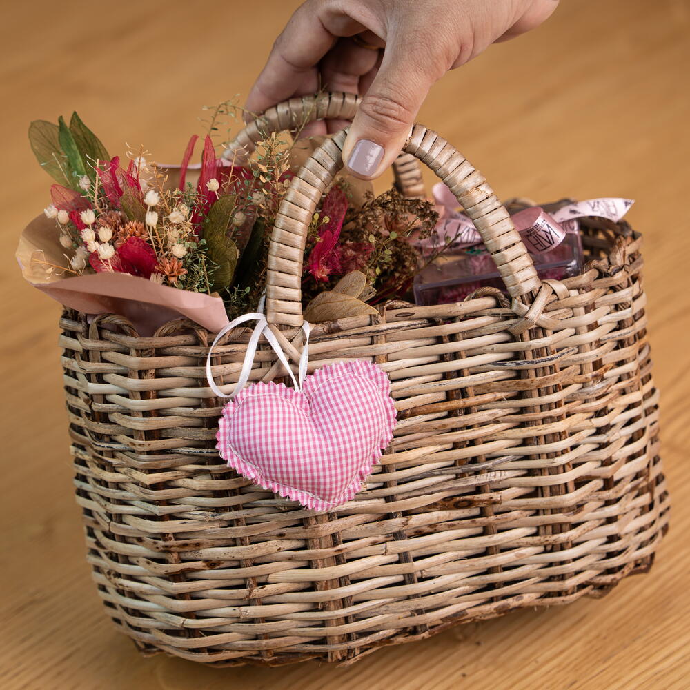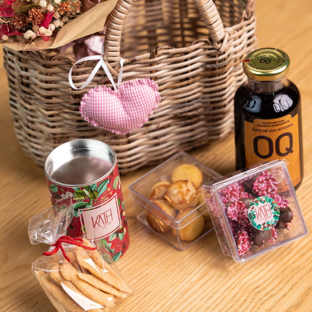 cesta de palha - 1 pcs mini buquê de flores desidratadas - 1 pcs suco de uva oq - 1 pcs tubolata com pétit four língua de gato - 1 pcs dragée de chocolate na caixa de acrílico - 1 pcs financiei na cx de acrílico - 1 pcs