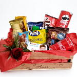 Cesta decorada contendo: 1 Barra de chocolate 1 Cookie 2 Pacotes sortidos de Bala Fini 1 Bolinho 1 Tubetes 1 Sucrilhos 1 Achocolatado 1 Coca-Cola mini 220ml 1 Batata Pringles 1 Kinder chocolate c/4 1 Pacote MMs de Chocolate 1 Rosa para presente