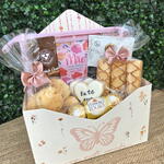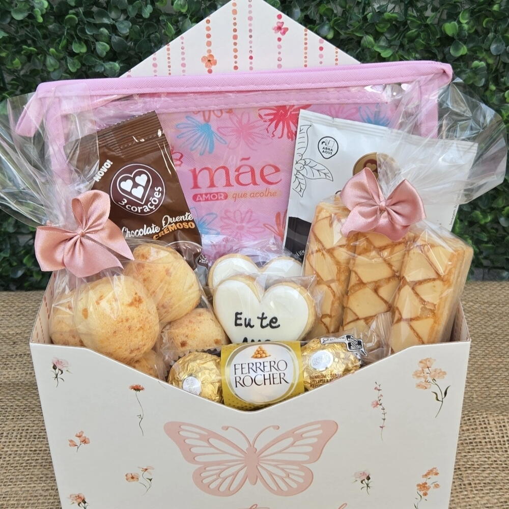 cesta - 1 pcs pães de queijo - 5 pcs biscoitos folhados doce - 1 pcs café gourmet 3 corações - 1 pcs chocolate quente cremoso 3 corações - 1 pcs biscoitos artesanais formato de coração escrito eu te amo - 2 pcs ferrero de 3 un - 1 pcs kit com 2 necessaries ( uma transparente e a de dentro temática para o dia das mães) - 2 pcs tag de dia das mães - 1 pcs chaveiro coração dourado escrito com amor - 1 pcs