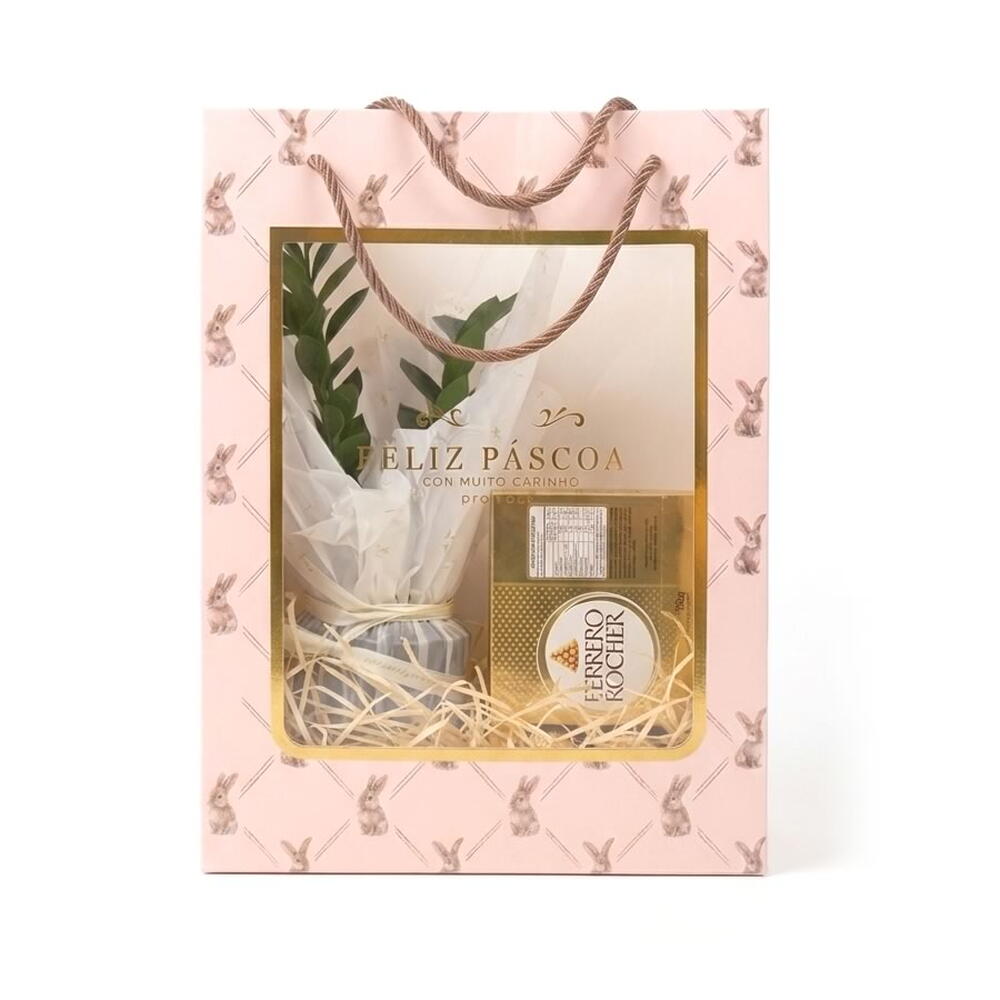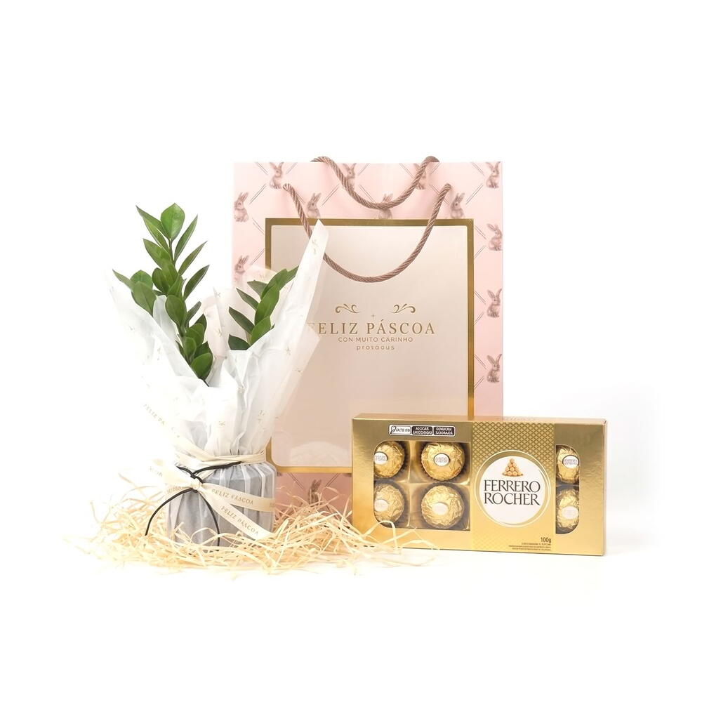 Transforme o dia de alguém especial com o nossa edição limitada de Páscoa com Zamioculca. Cuidadosamente preparado para encantar e surpreender, esse kit traz uma sacola elegante e luxuosa com detalhes dourados e a frase Feliz Páscoa com muito carinho. Composto por um vaso com a planta Zamioculca, conhecida como a Planta da Fortuna e muito usada para atrair prosperidade no Feng Shui e exige baixíssima manutenção. Esse arranjo é perfeito para presentear pessoas especiais com a força e simbolismo da Páscoa. Itens Inclusos: 01 Vaso com Planta Zamioculca (30cm de altura x 10cm de largura) 01 Caixa de Chocolate Ferrero Rocher com 8 unidades (100g) 01 Sacola Luxo Feliz Páscoa