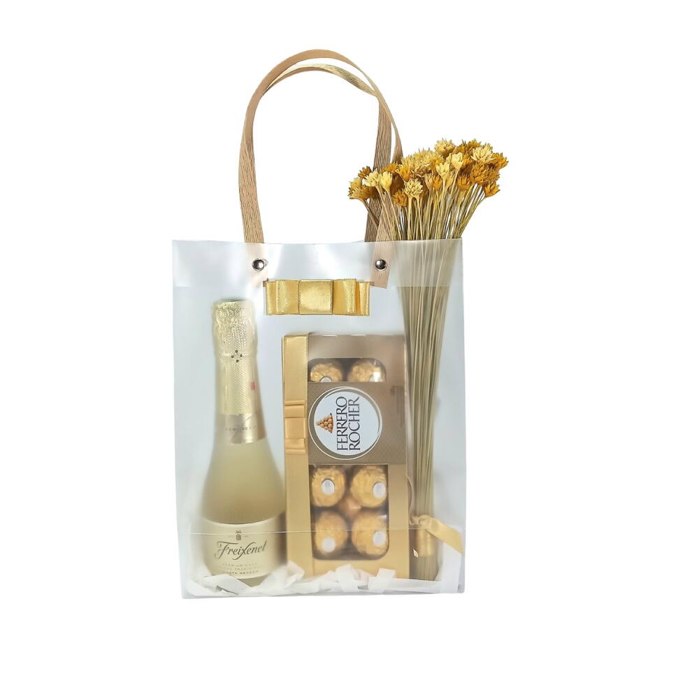 espumante freixenet cava 200ml - 1 pcs caixa de bombons ferrero rocher 100gr - 1 pcs buquê de flores secas espeta nariz - 1 pcs sacola presente em acetato - 1 pcs