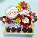 cartão personalizado - 1 pcs mini bolo - 1 pcs docinhos gourmet - 8 pcs mini buquê floral - 1 pcs bebida (consulte opções disponíveis) - 1 pcs